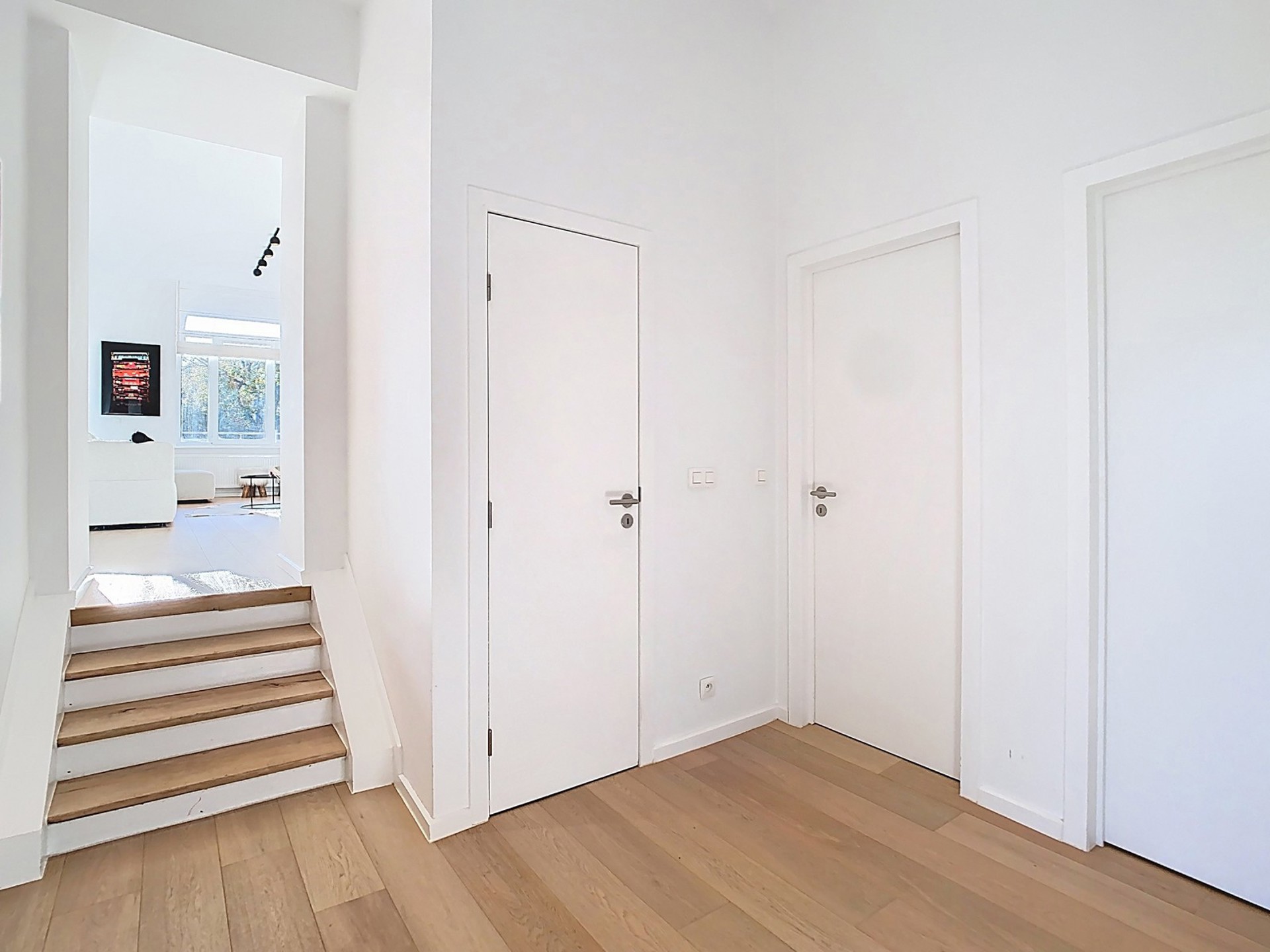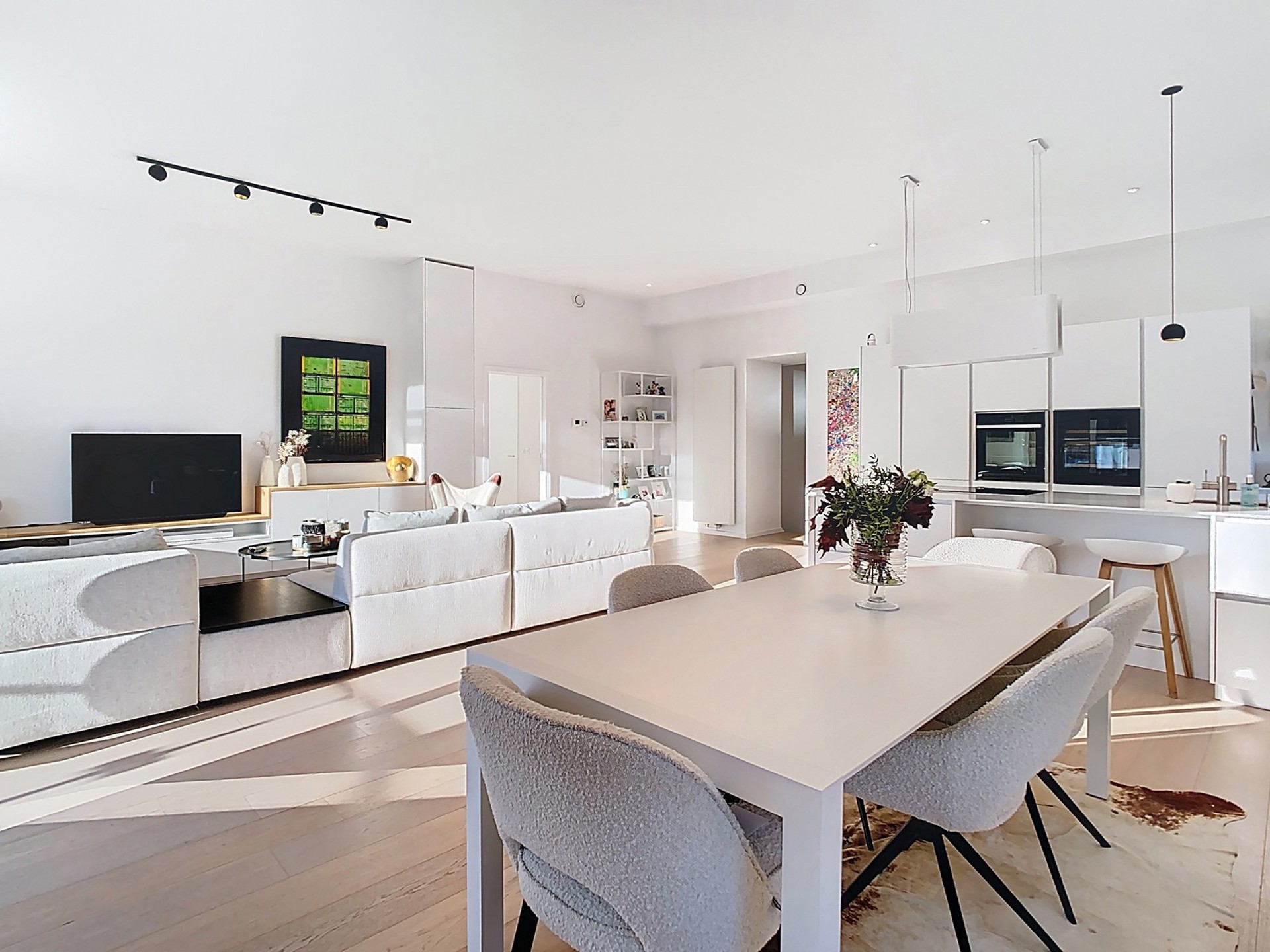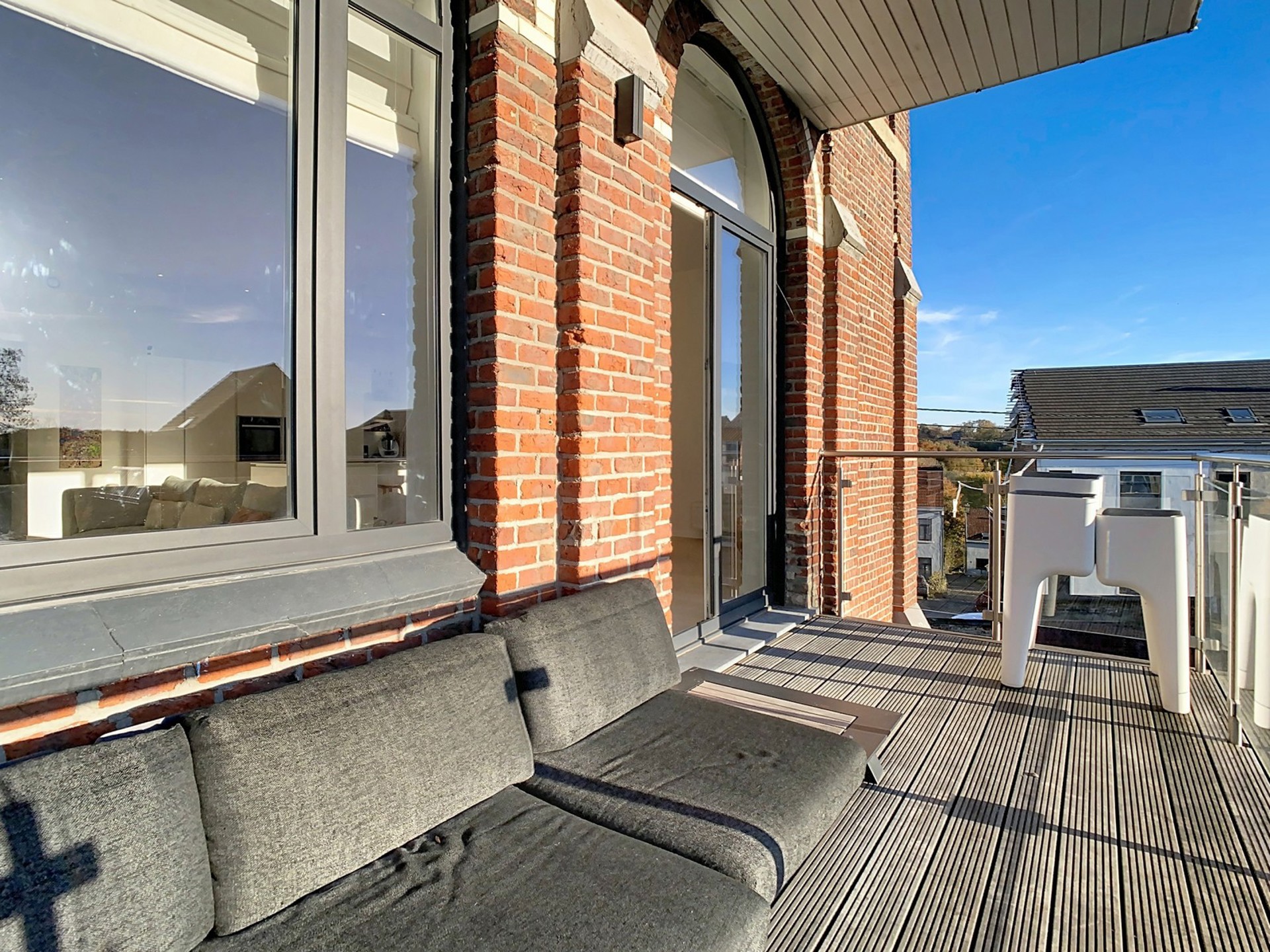 Séjour spacieux et lumineux de +/- 58,50 m² donnant accès à la terrasse en Bankirai de 11 m².