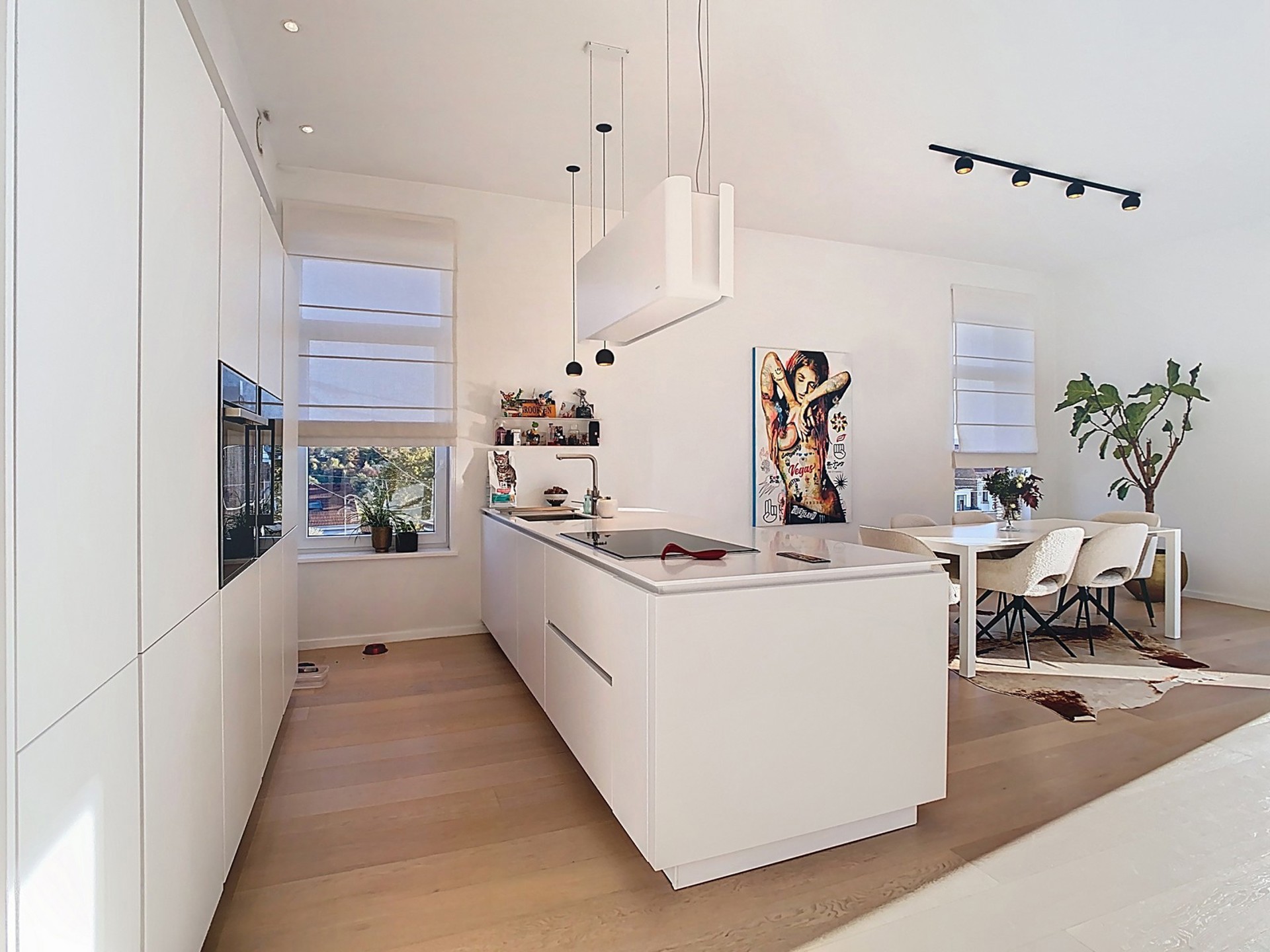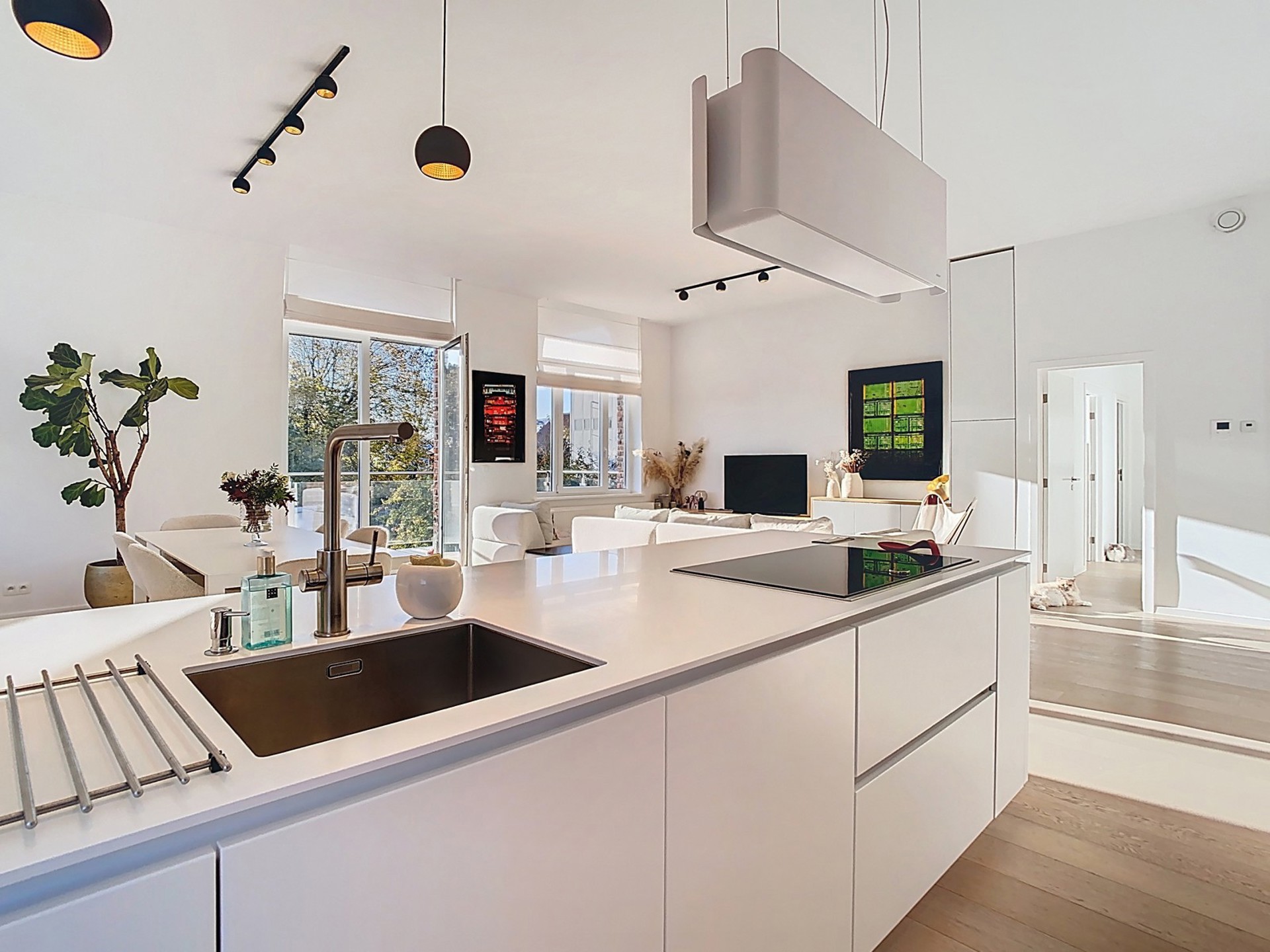 Cuisine super équipée ouverte sur le séjour (électroménagers NEFF, taque induction, évier inox, frigo, congélateur, frigo à vins, four, mitigeur Grohe Blue Home qui à la fois filtre l’eau et fait de l’eau gazeuse.).
