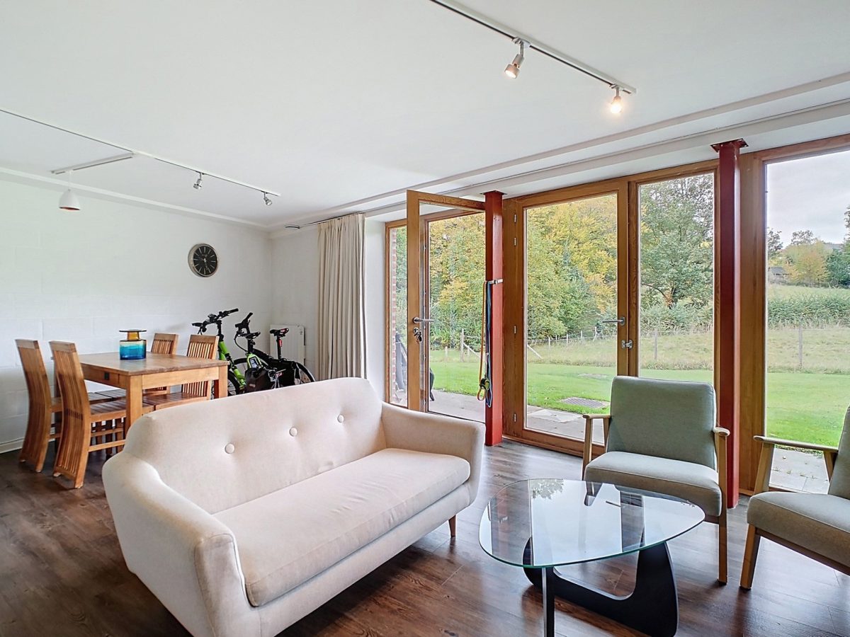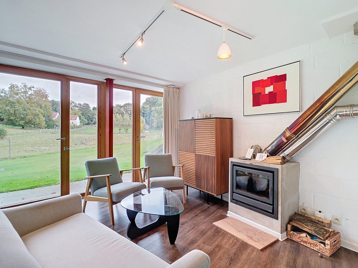 Séjour lumineux de 25 m² avec poêle à bois, accès à la terrasse / au jardin et bénéficiant d’une belle vue.