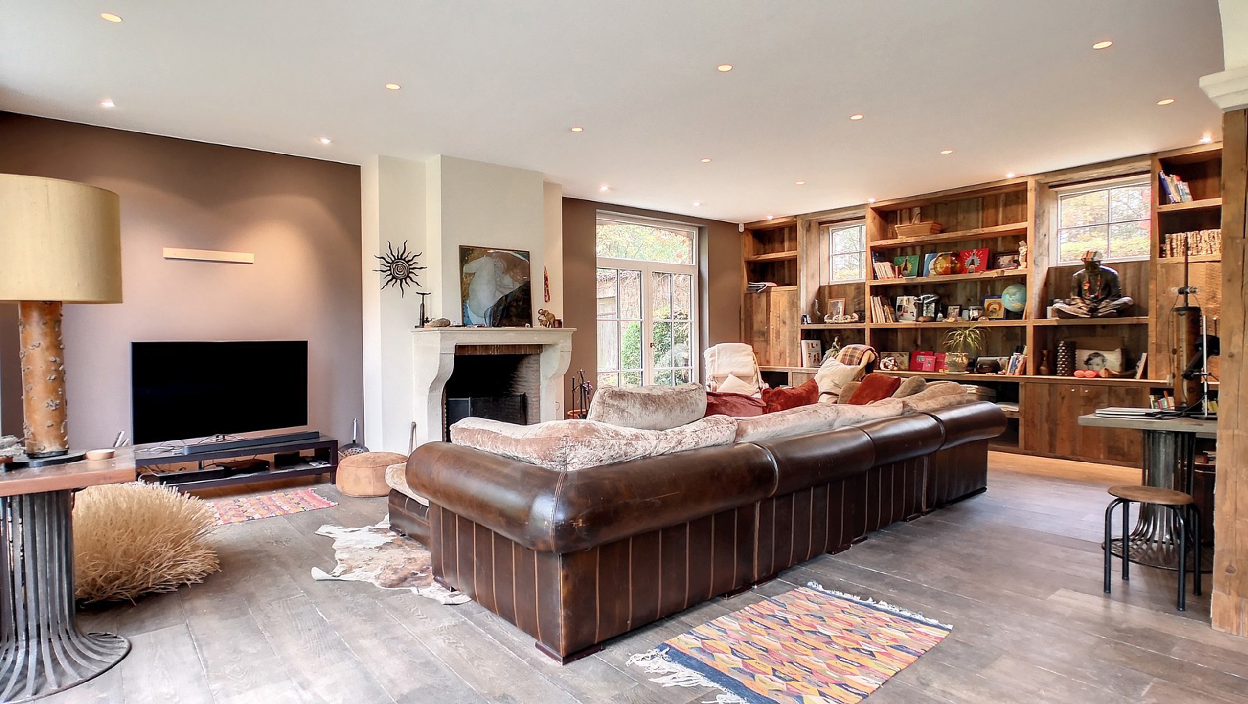 Séjour spacieux de 60 m², accueillant et lumineux, comprenant une salle à manger et un salon agrémenté d’un beau feu ouvert en pierre de France, d’un grand meuble étagère sur mesure, d’une superbe vue et d’un accès au jardin (plancher).