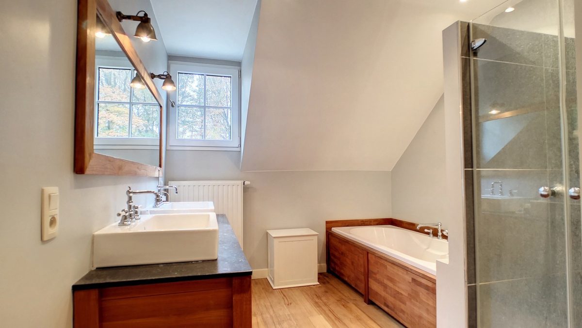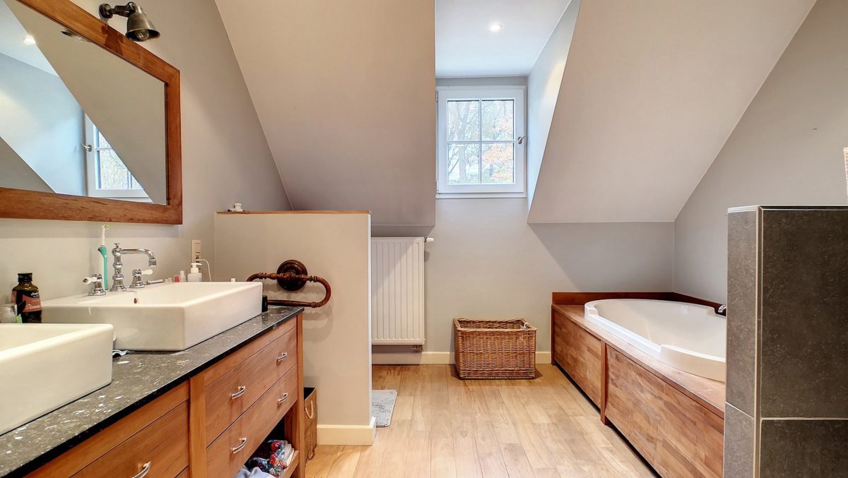 Salle de bains de 11 m² (baignoire, meuble double lavabo, douche italienne).