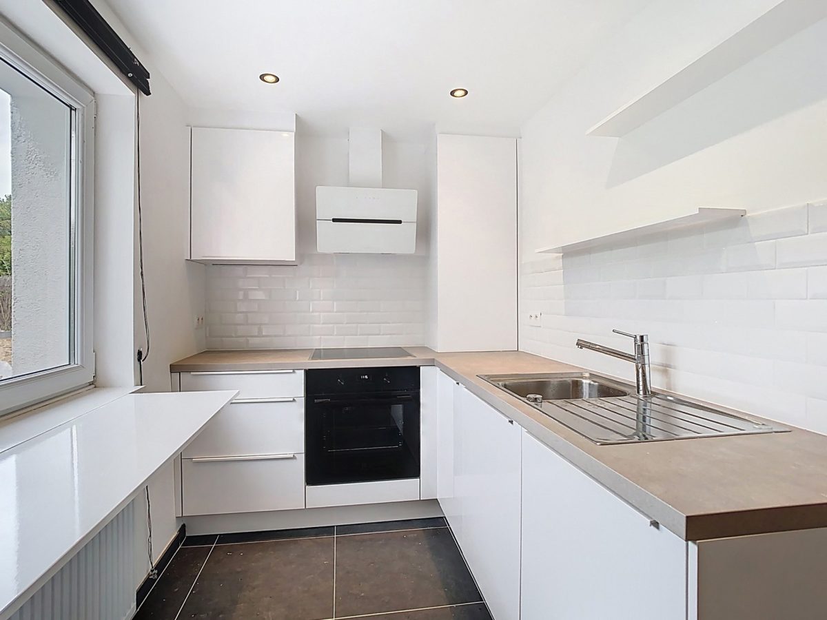 Cuisine équipée neuve avec petit coin à déjeuner (hotte, taque vitro, four, frigo + congélateur et lave-vaisselle).