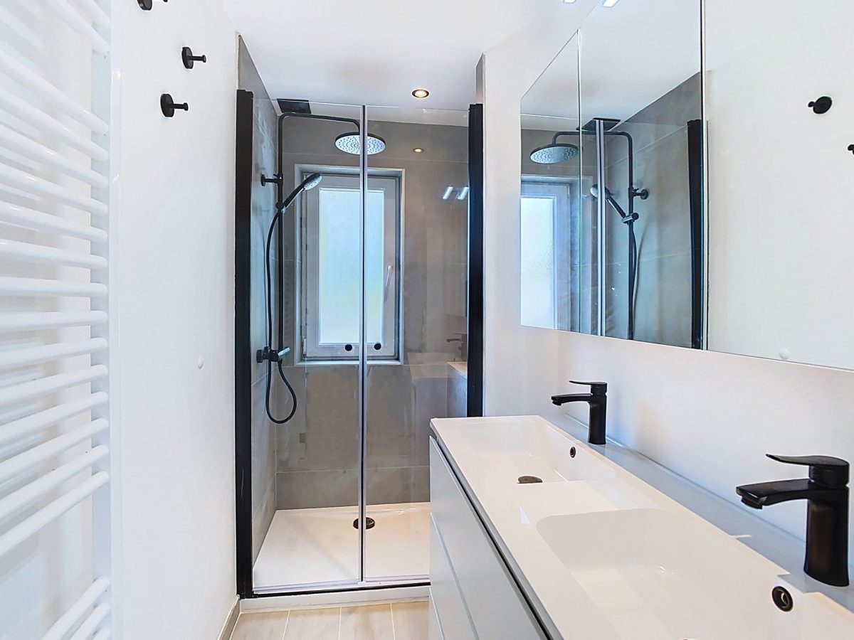 Salle de douches (meuble double lavabo, douche, pharmacie murale et radiateur Acova).
