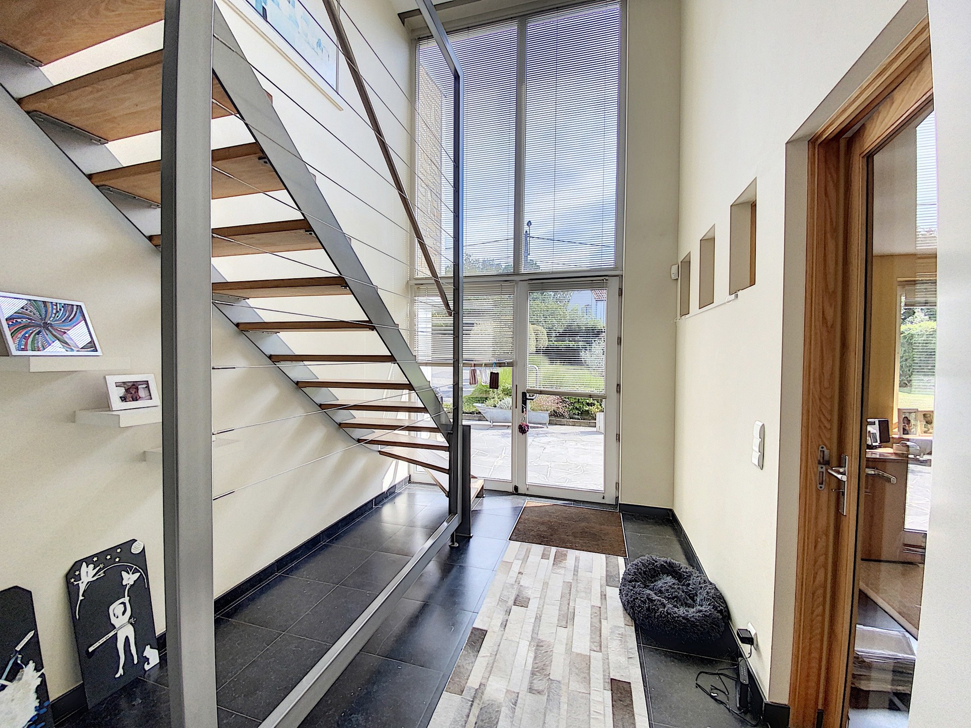 Hall d’entrée avec toilette et lave-mains, accès vers l’étage.
