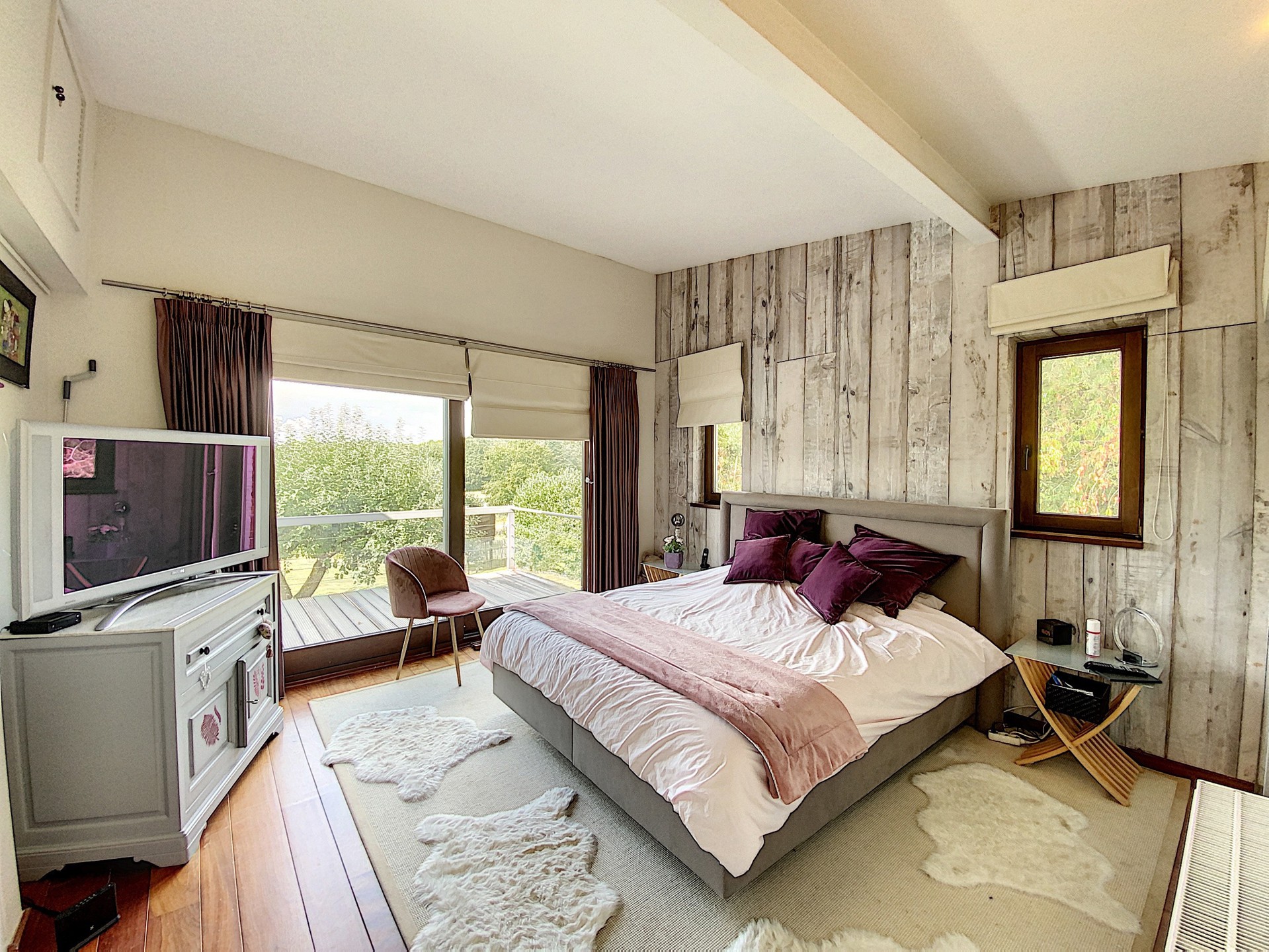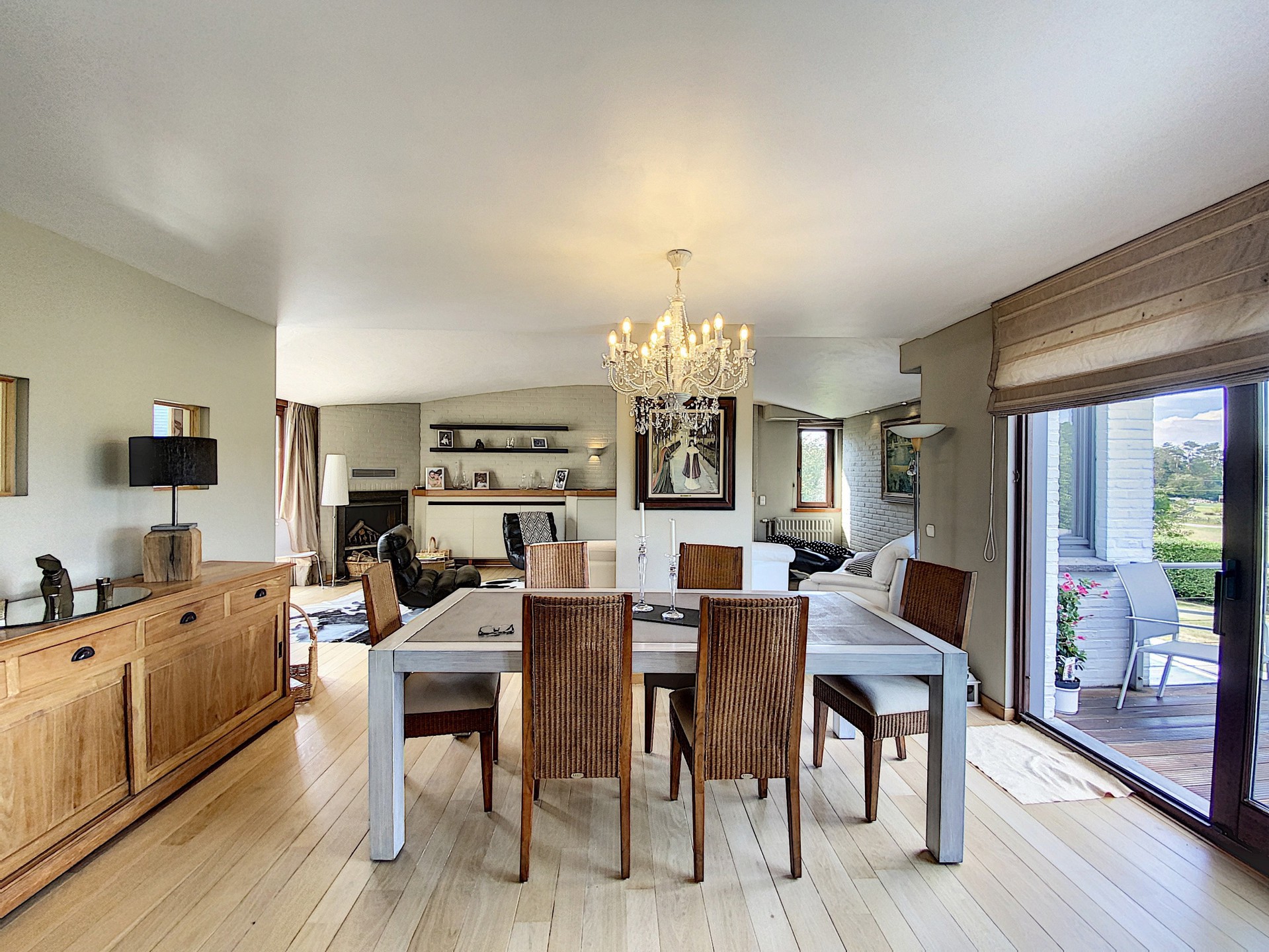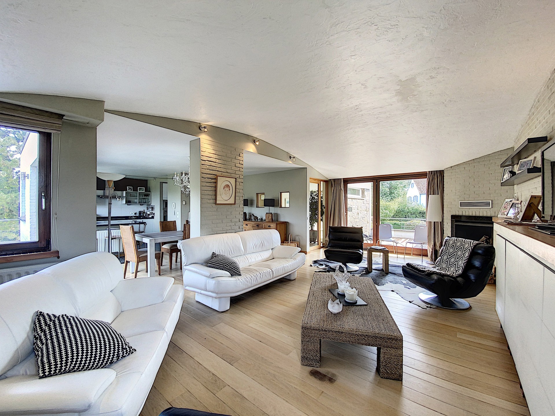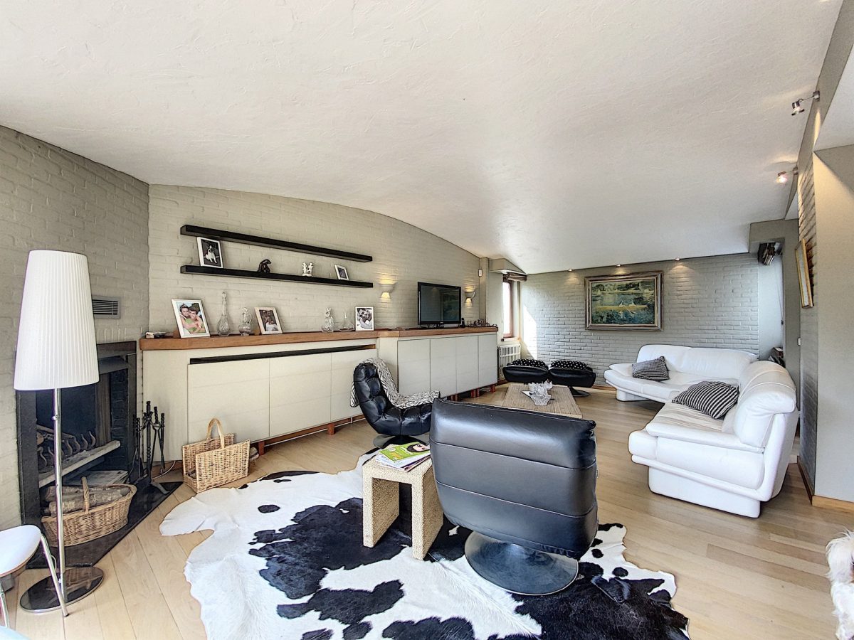 Living de 59 m² avec feu ouvert et meubles encastrés, accès à la terrasse côté avant de la maison et côté arrière également.