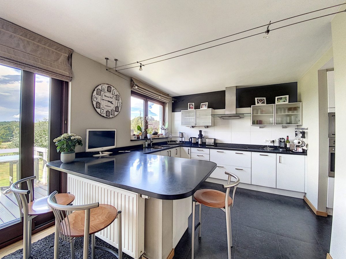 Cuisine super équipée de 12 m² ouverte sur le living avec îlot central et dégagement vers le hall de nuit.