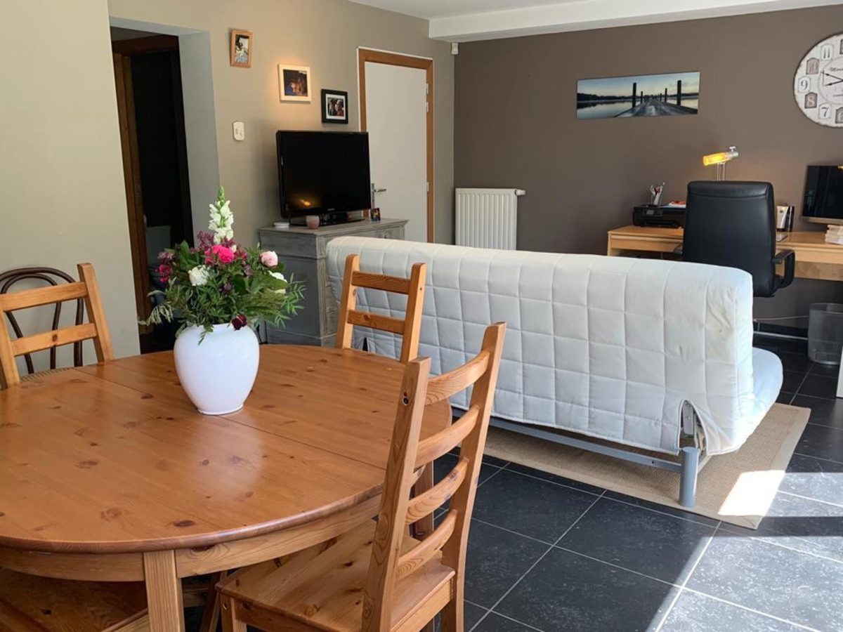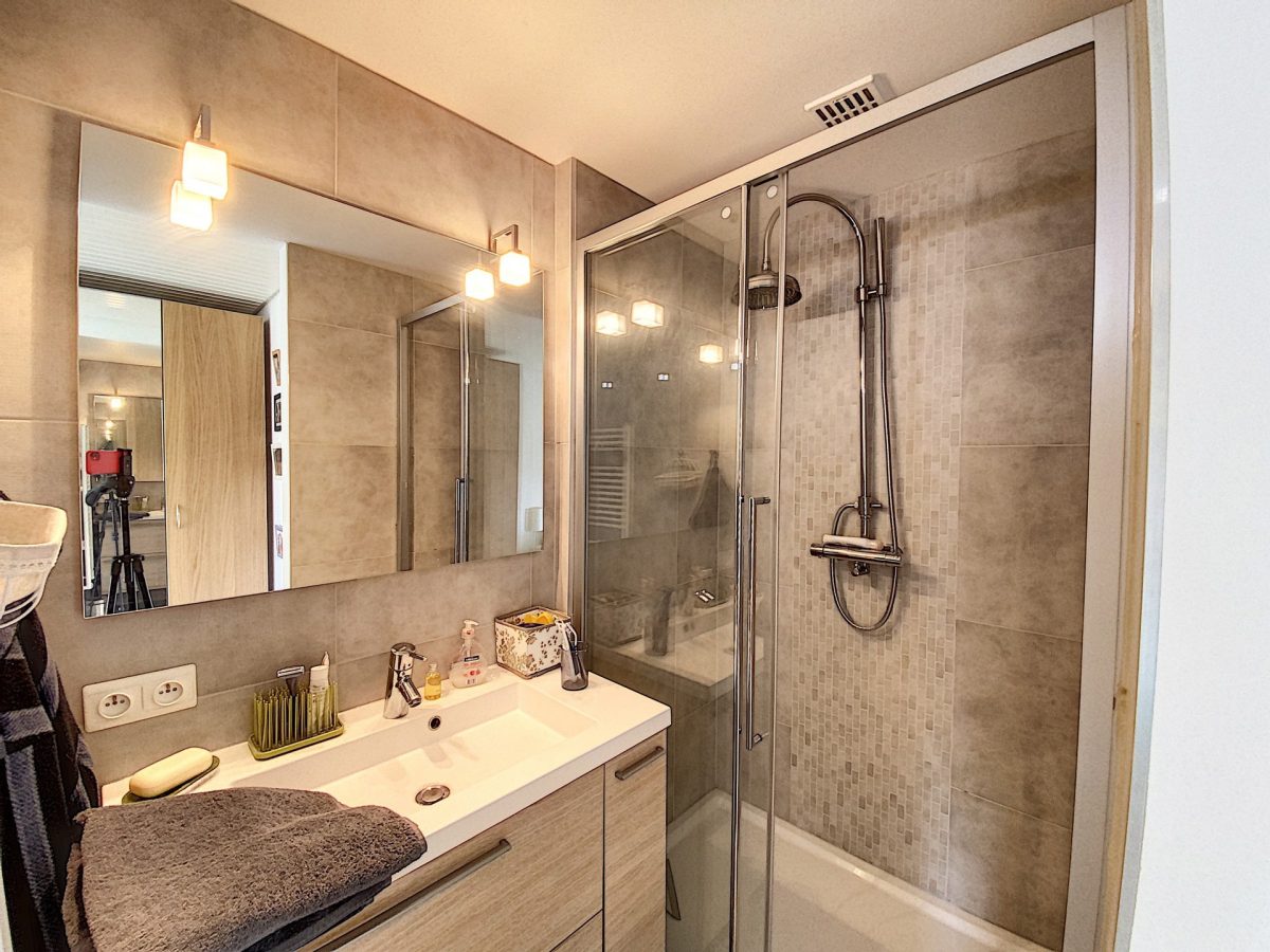 Appartement avec cuisine ouverte sur le living 28 m², feu ouvert, alarme, entrée indépendante et terrasse privée exposée Sud/Ouest.