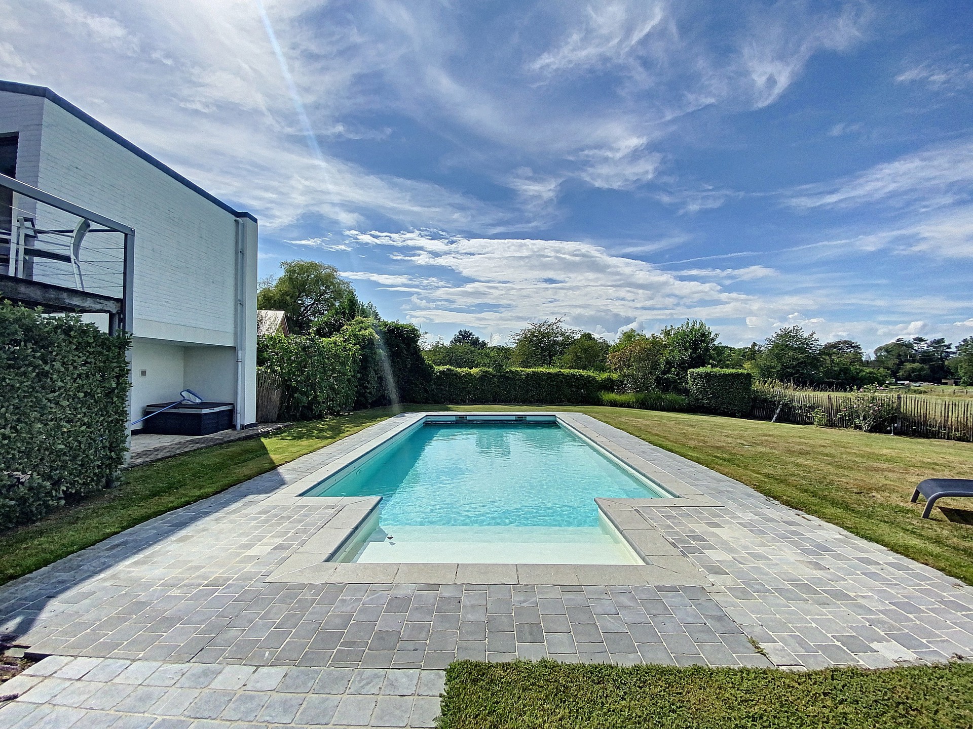 Piscine avec volet solaire automatique.