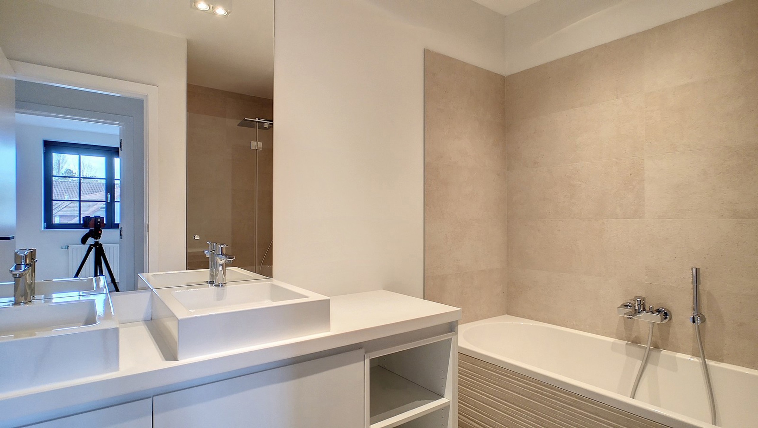 Salle de bains (baignoire, douche italienne, meuble double lavabo).