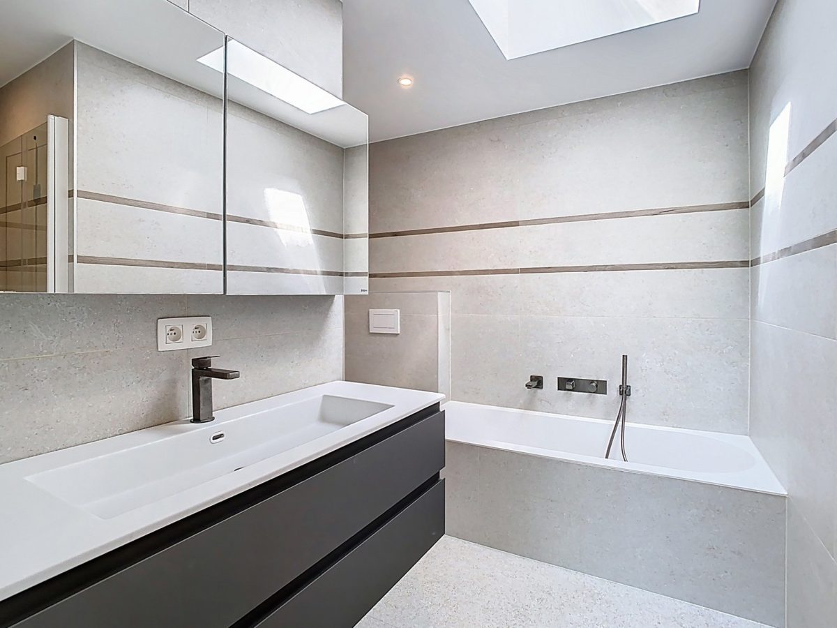 Surface habitable de +/- 135 m² + terrasses (13-8-7-5 m²) + 1 cave + 2 emplacements de parking intérieur.