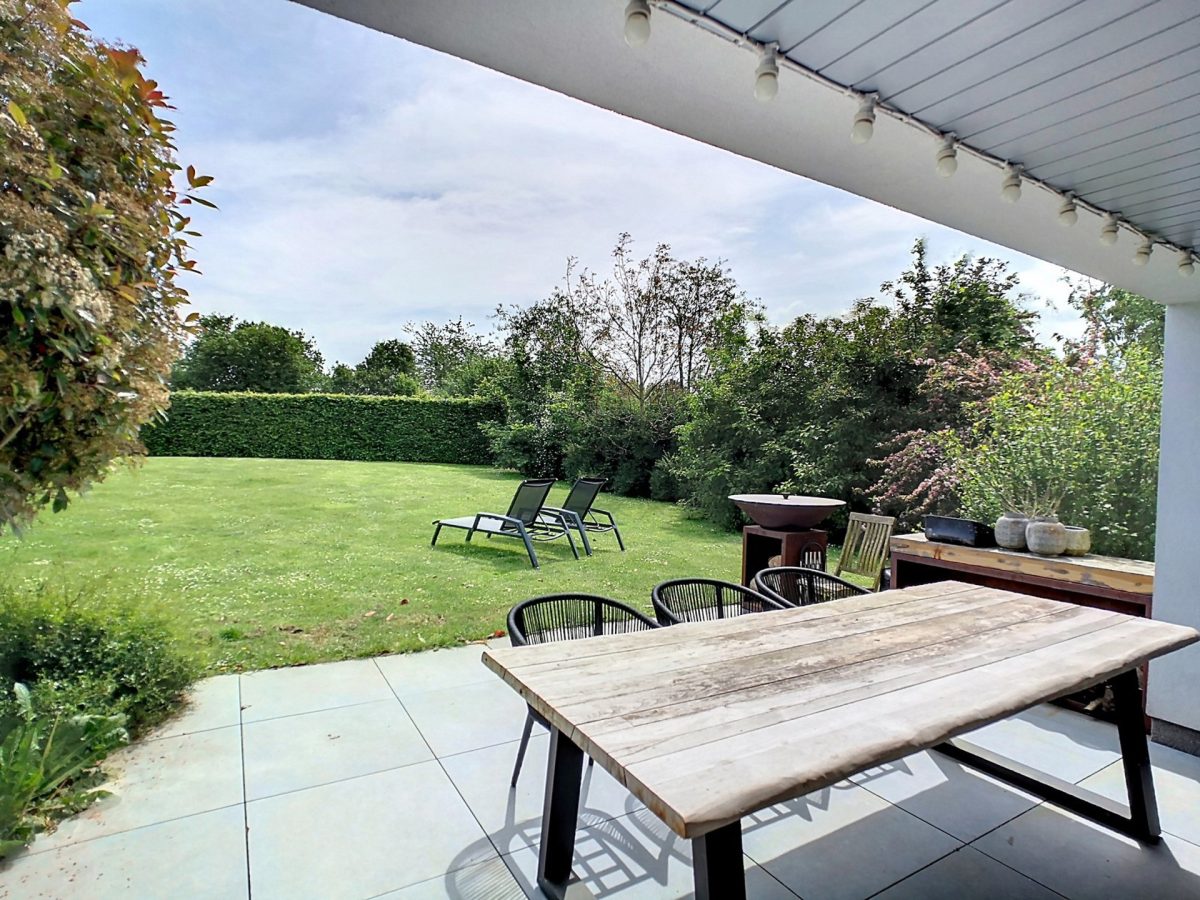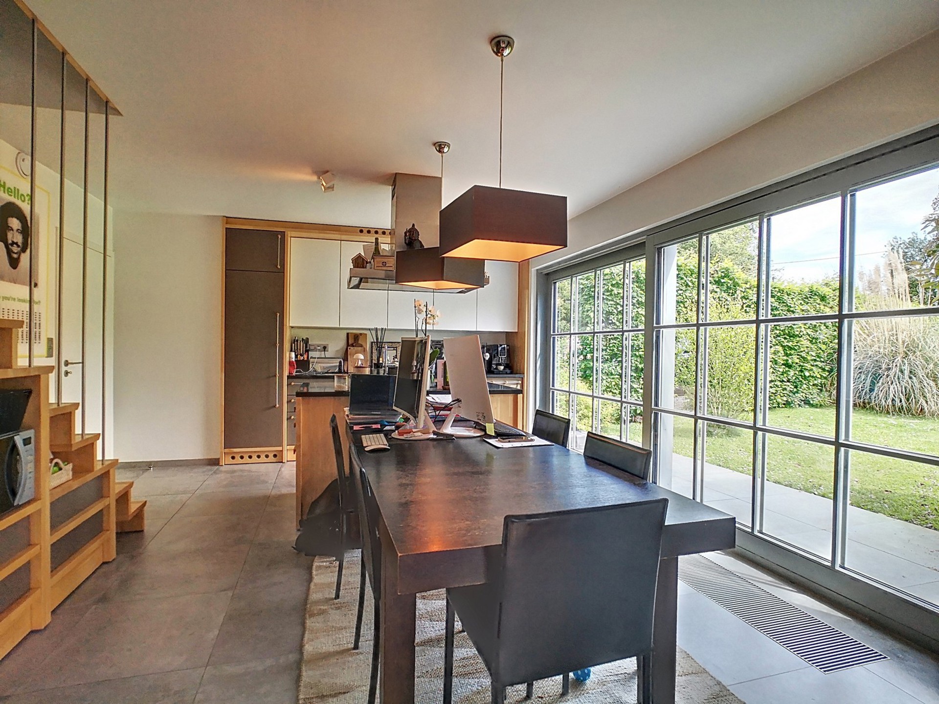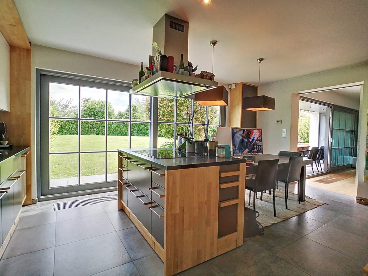 Cuisine super équipée spacieuse de 25 m² avec îlot central, coin à déjeuner et accès au jardin (lave-vaisselle, frigo encastré, taque vitro-céramique, four et armoires de rangements).