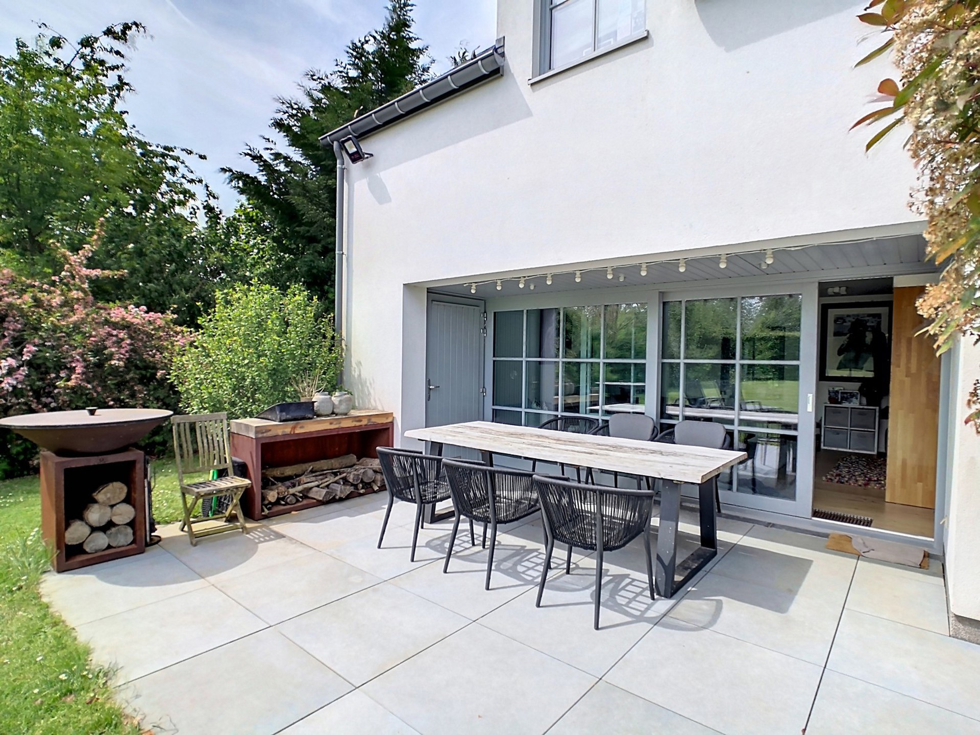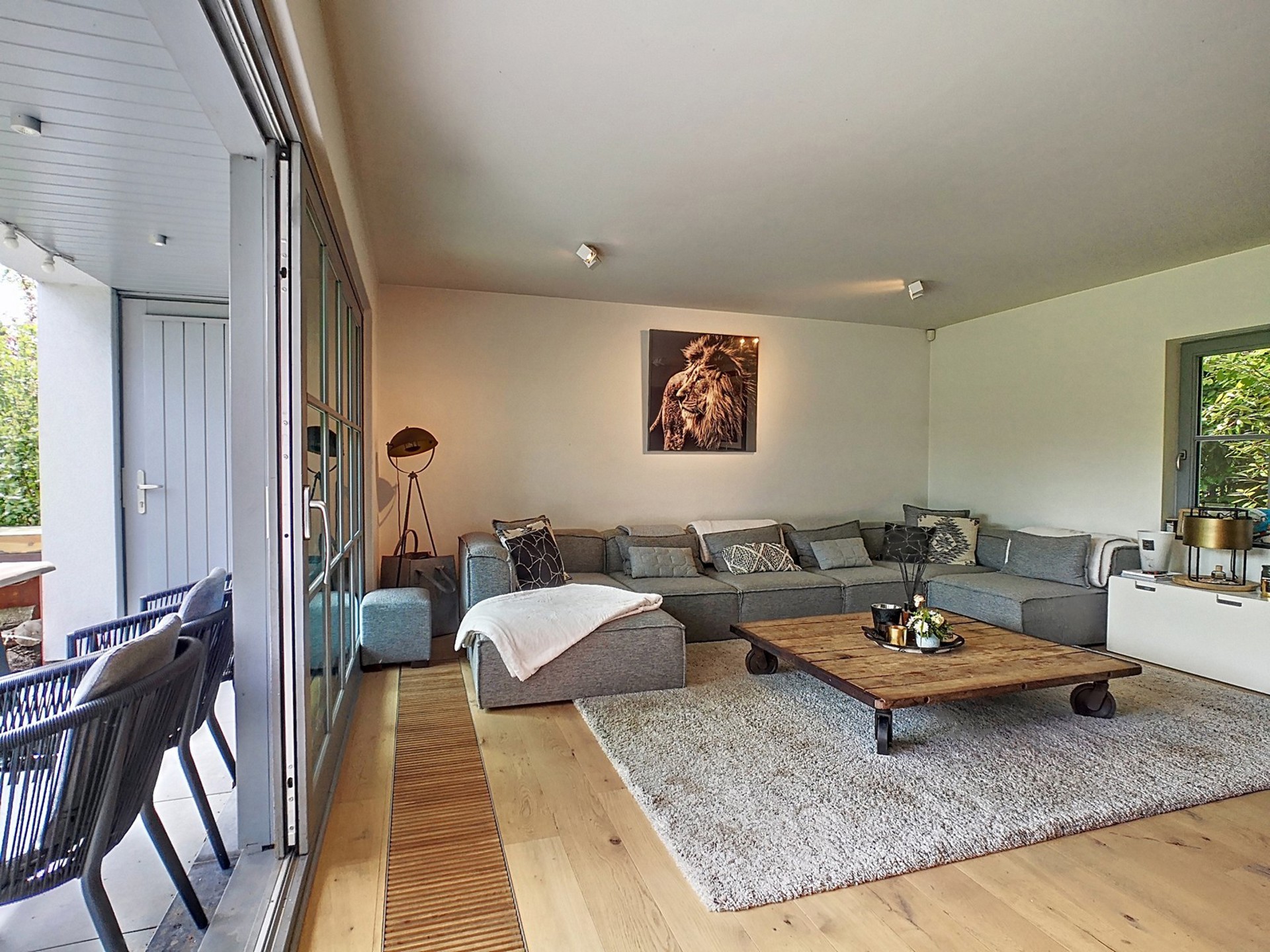 Séjour convivial de 30 m² agrémenté d’un bel insert au gaz et de grandes baies vitrées donnant accès au jardin.