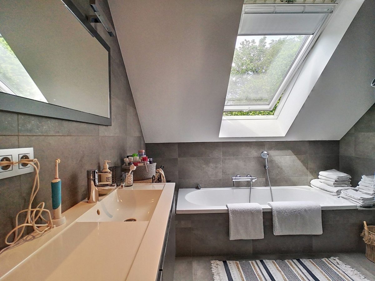 Salle de bains de 8,5 m² (meuble double lavabo, douche, baignoire, toilette).