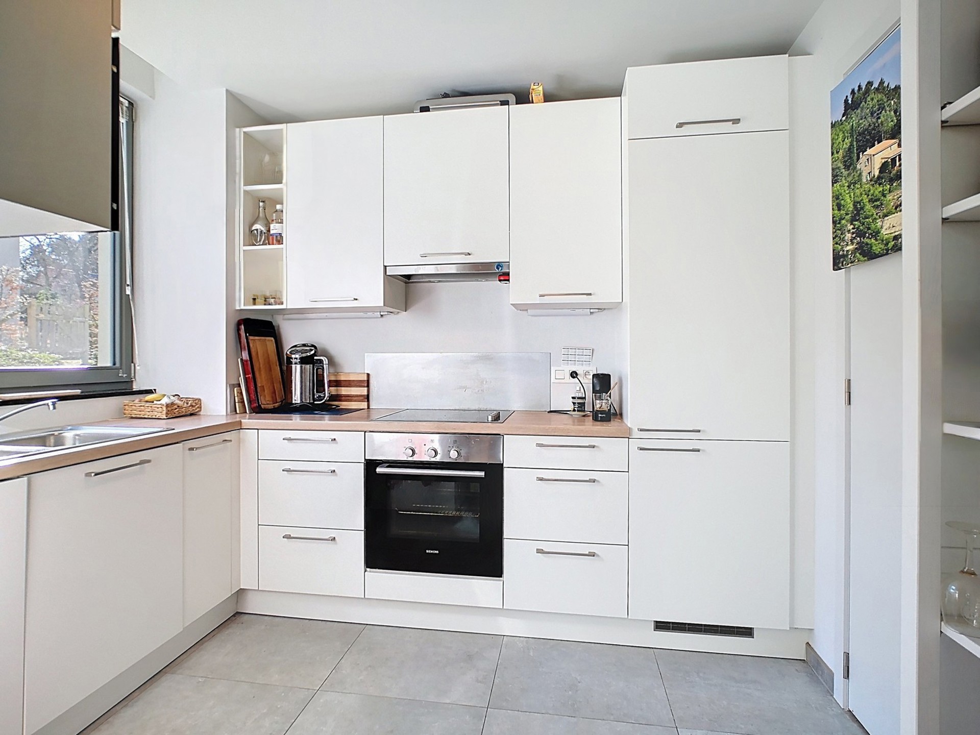 Cuisine super équipée de 6,65 m², ouverte sur le séjour (lave-vaisselle, frigo/congélateur, micro-onde encastré, taque de cuisson, four, hotte, rangement).