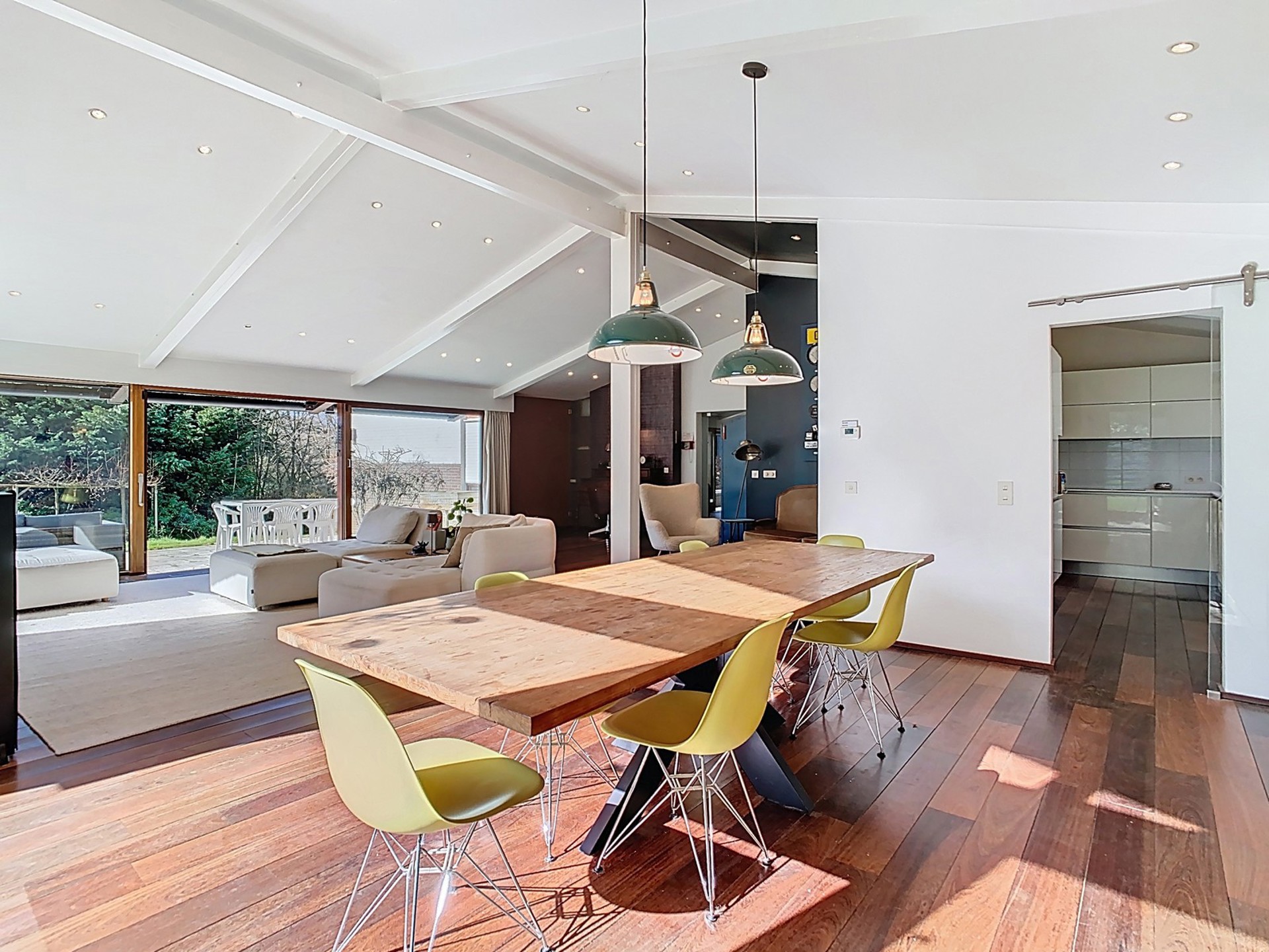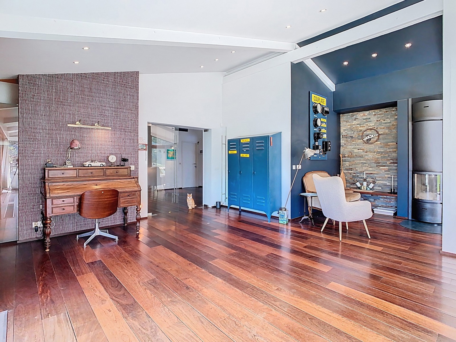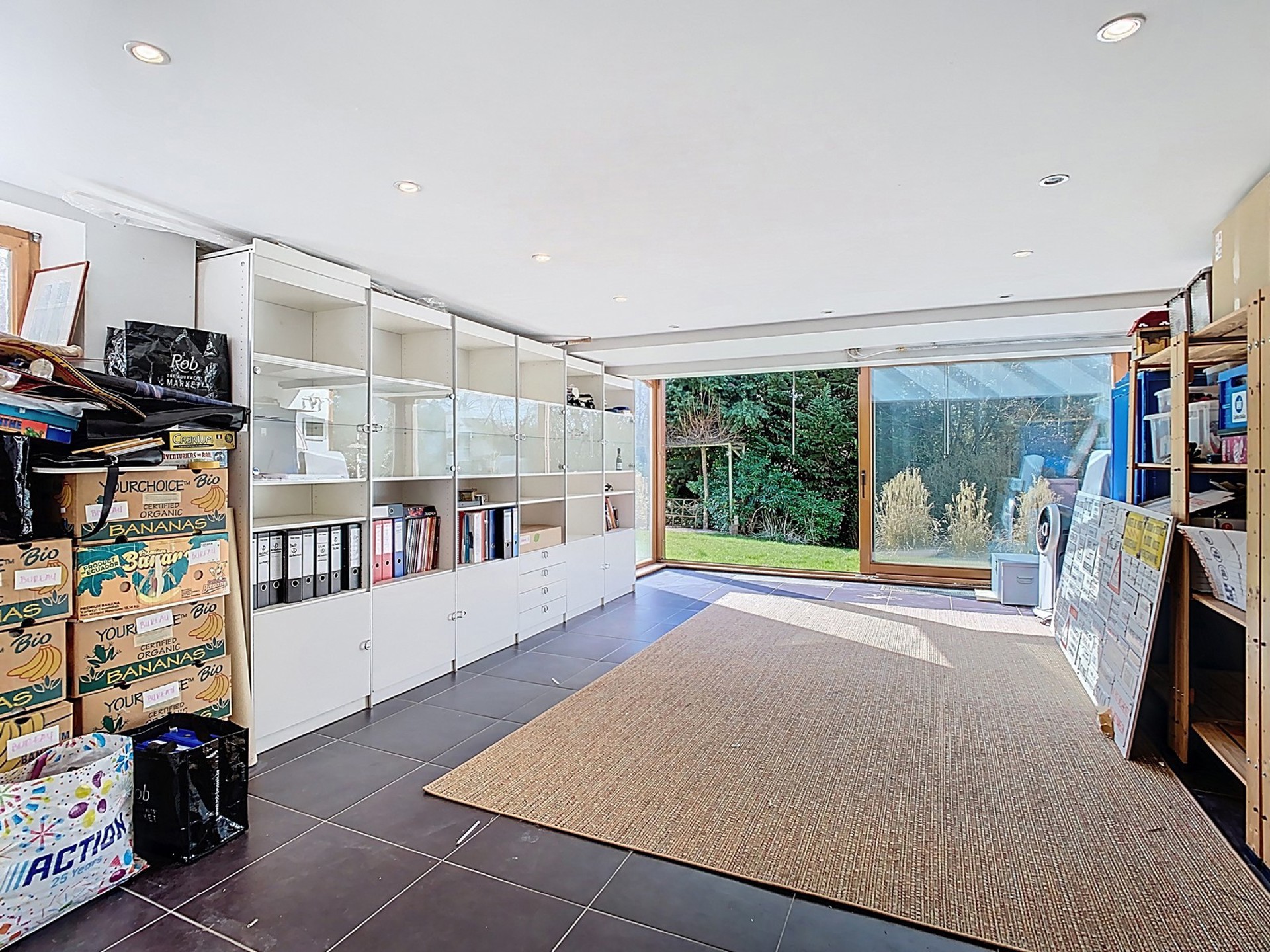 Spacieuse et lumineuse salle de jeux de 32 m², agrémentée d’une petite extension véranda (revêtement sol dallage noir).