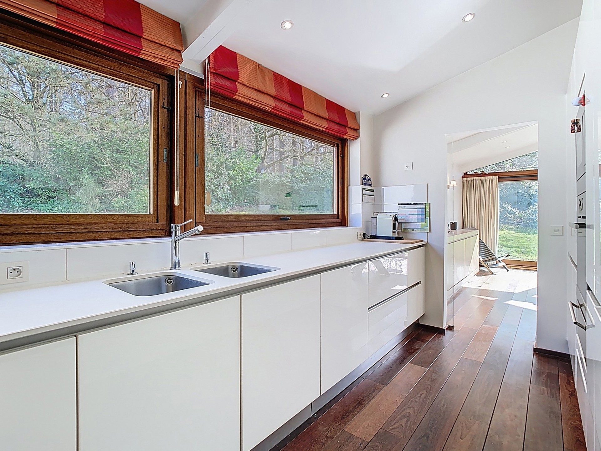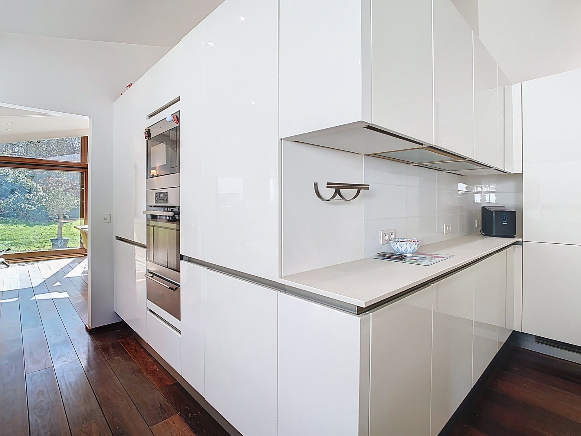 (mobilier de cuisine blanc, taques de cuisson à induction (5 zones) type Smeg, four traditionnel, micro-ondes et chauffe-plat encastré type AEG (1 an), double réfrigérateur et congélateur Siemens, évier double en inox, plan de travail en corian).