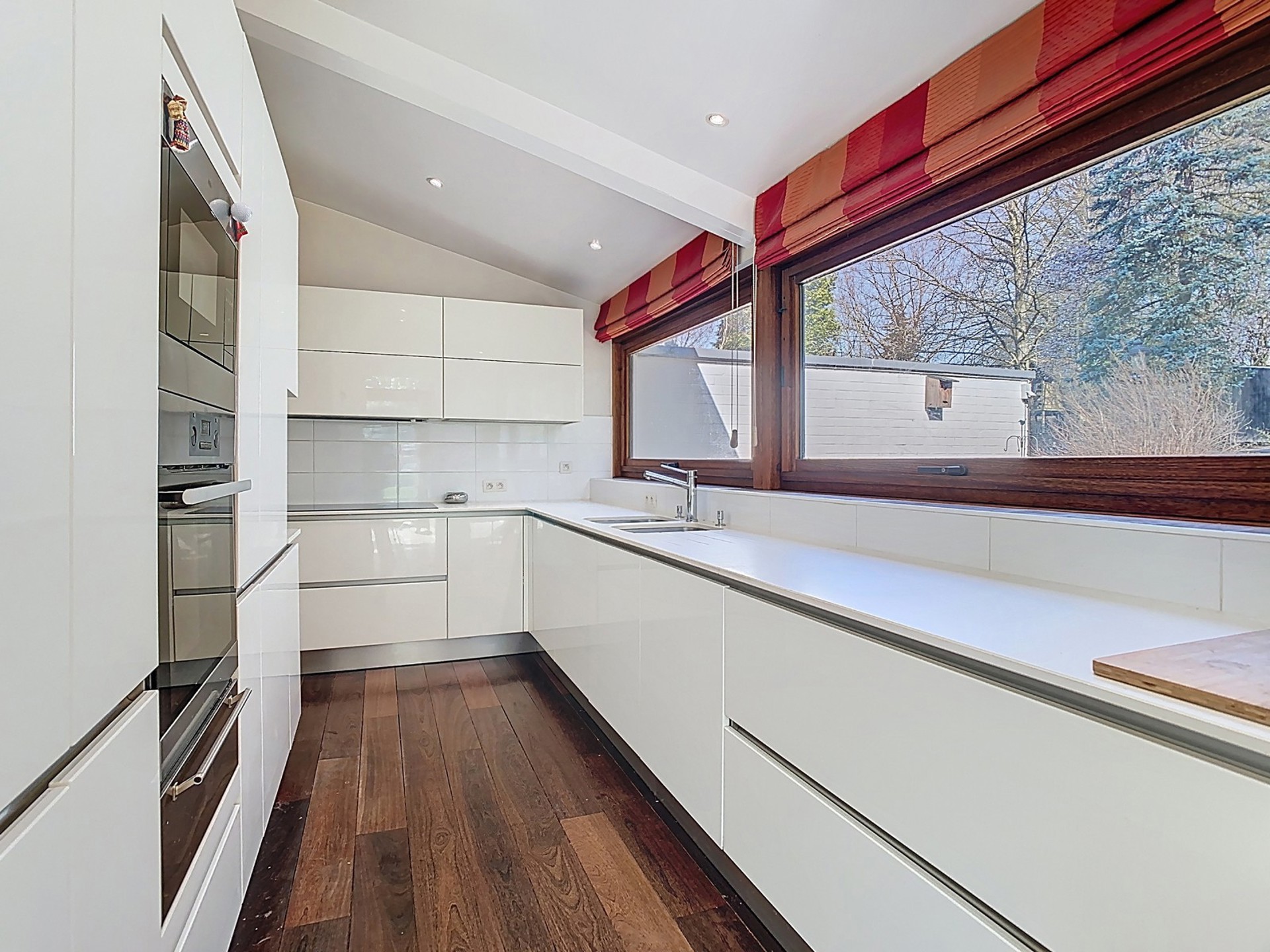 Cuisine équipée en L de 16 m², très lumineuse et bénéficiant de nombreux rangements.