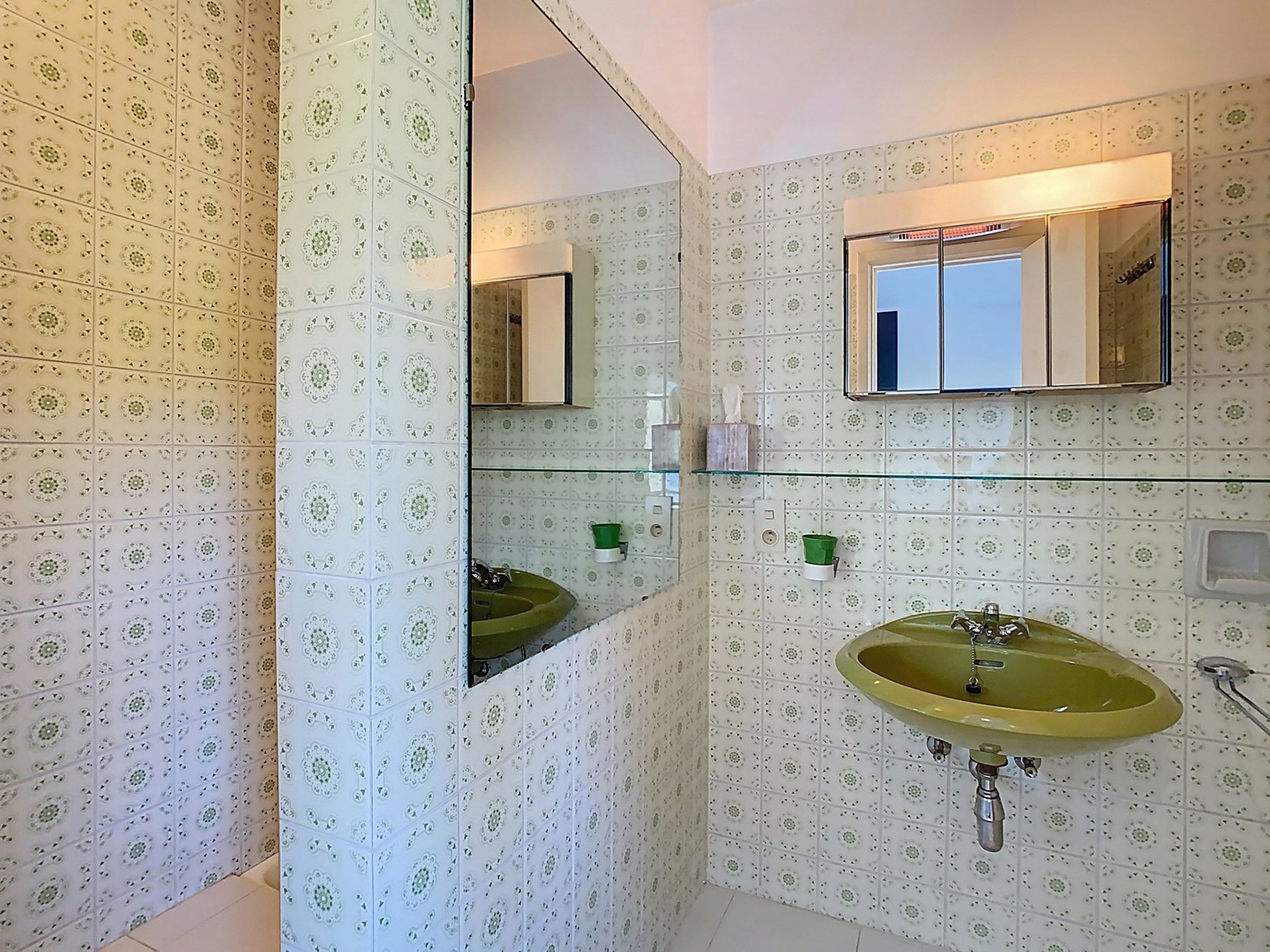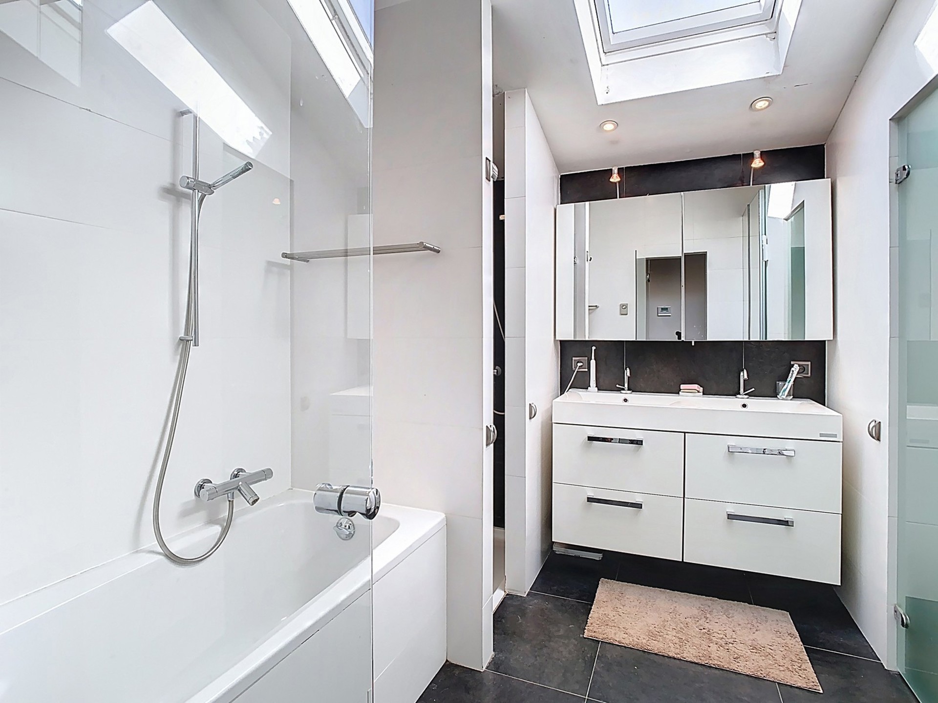 Chambre 3 de 16 m² avec placards intégrés et salle de bains rénovée de 5,50 m² (double lavabo, douche et baignoire – revêtement sol carrelage imitation bois).