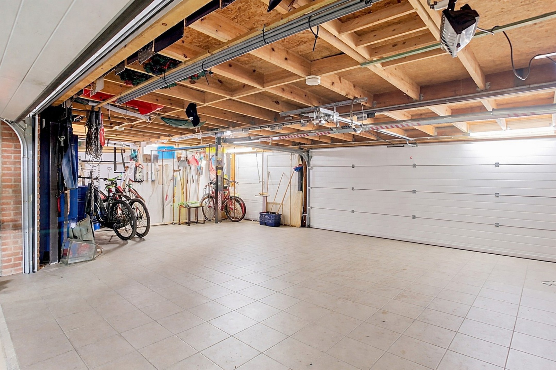 Grand garage de 41 m² permettant le stationnement de deux voitures, avec porte sectionnelle double et espace de rangement pour les outils.