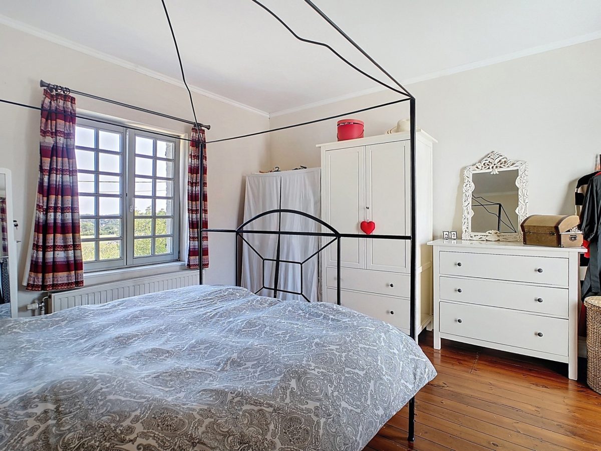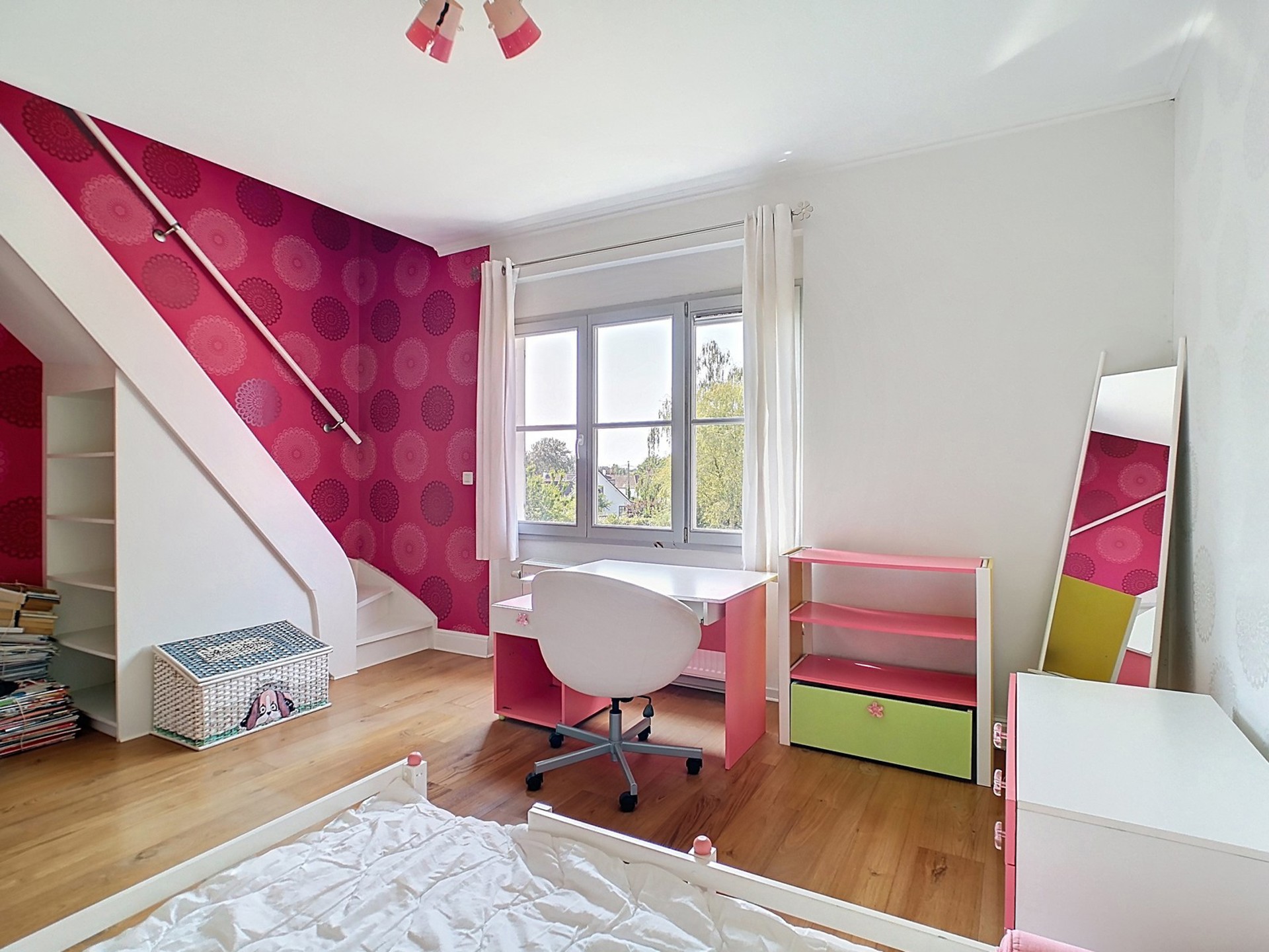 Chambre 2 de 19 m² avec vue sur le jardin et accès à l’étage 2.