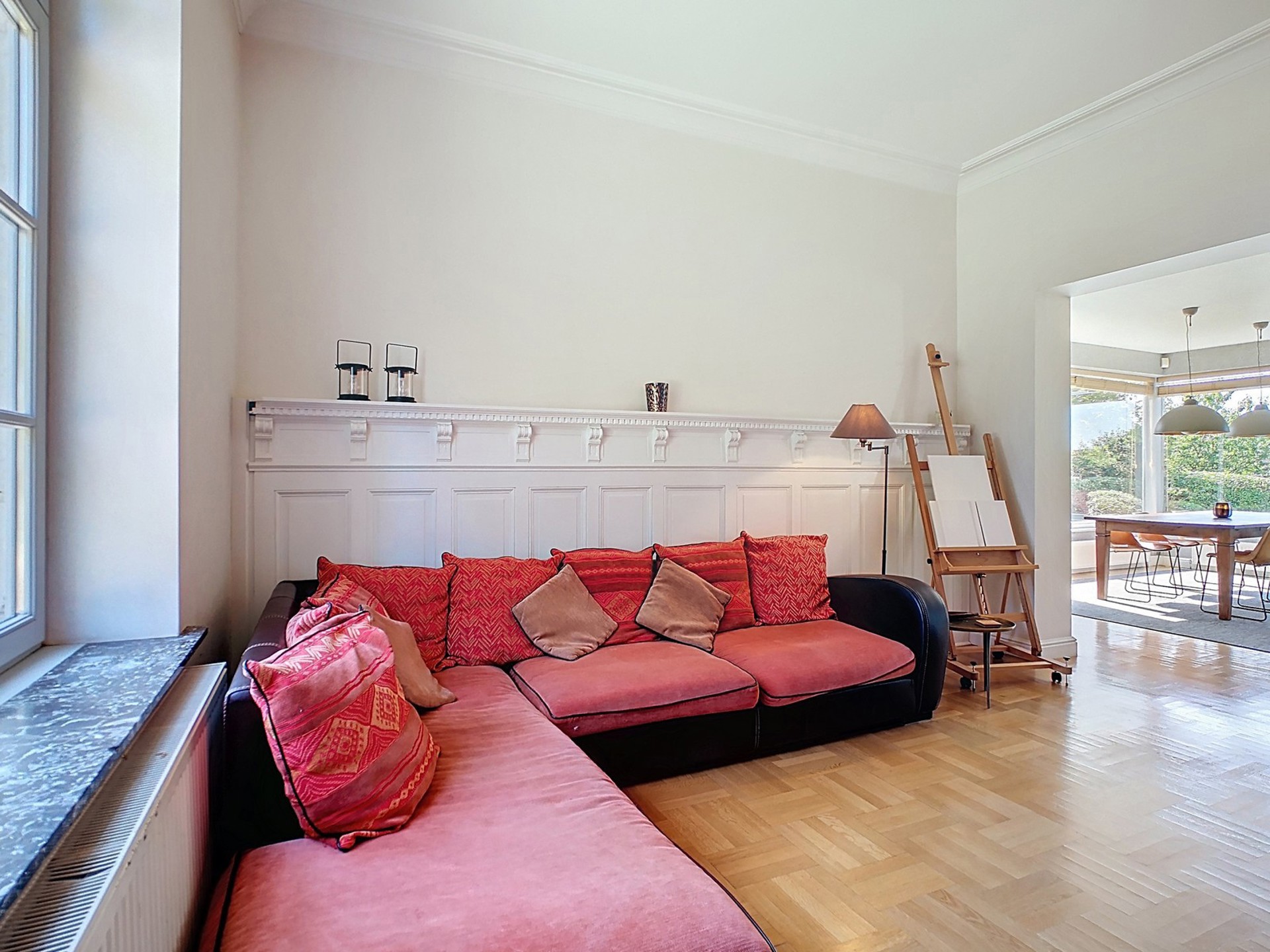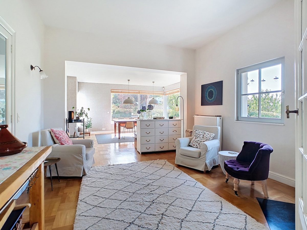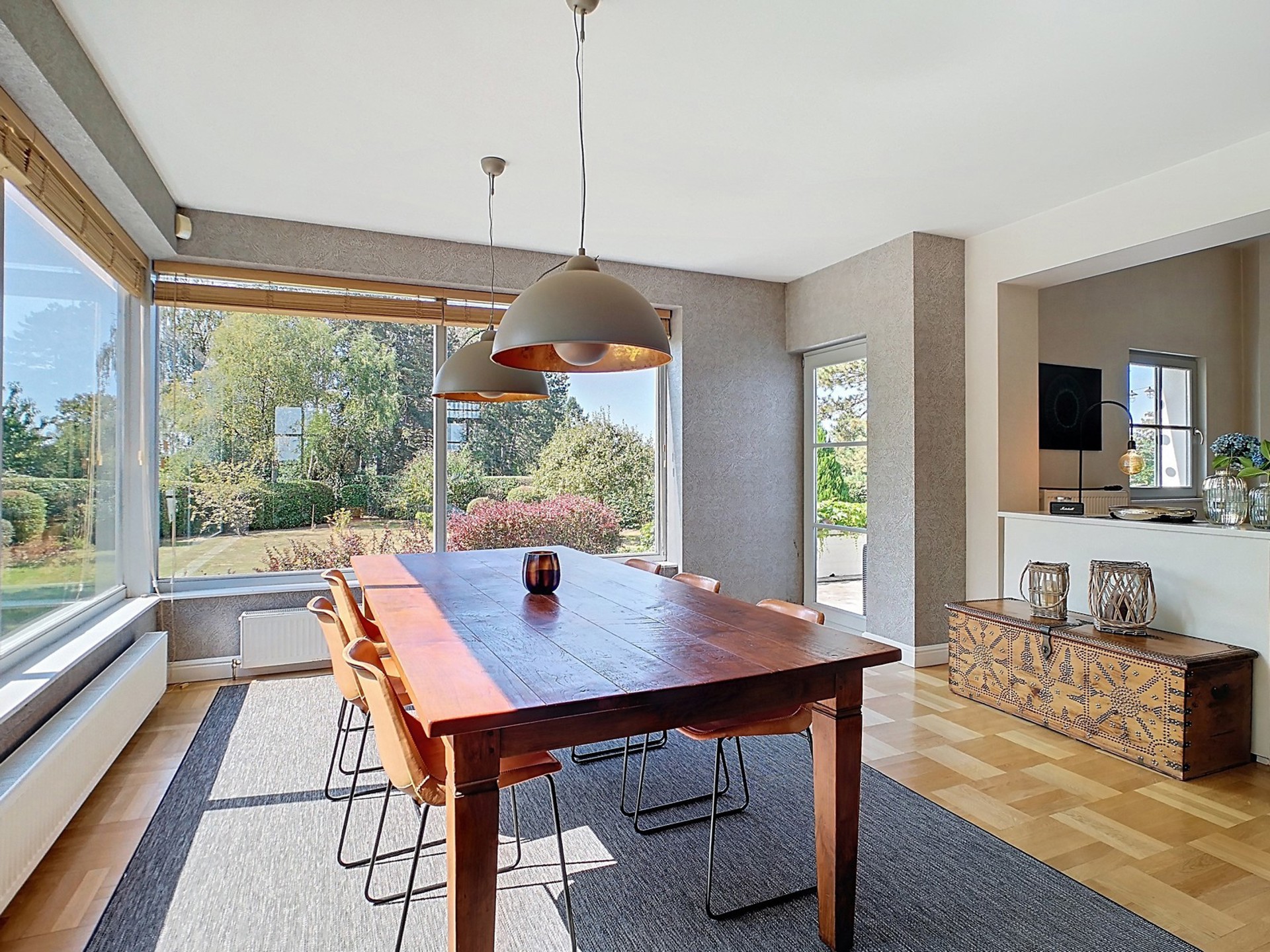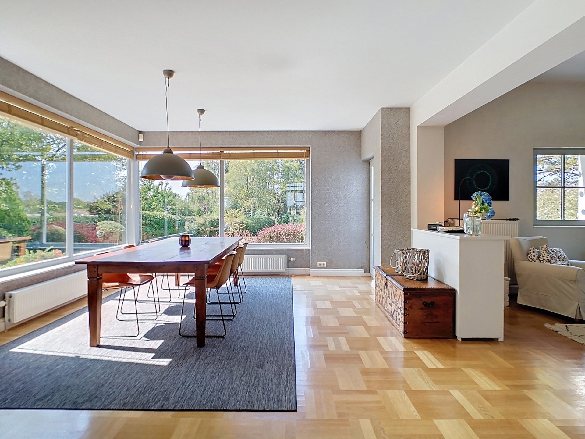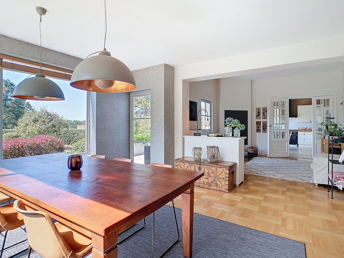 Séjour de 60 m², spacieux et lumineux, comprenant un salon avec feu ouvert à cassette, une grande salle à manger en contact étroit avec la nature et un coin TV plus cosy avec lambris aux murs.