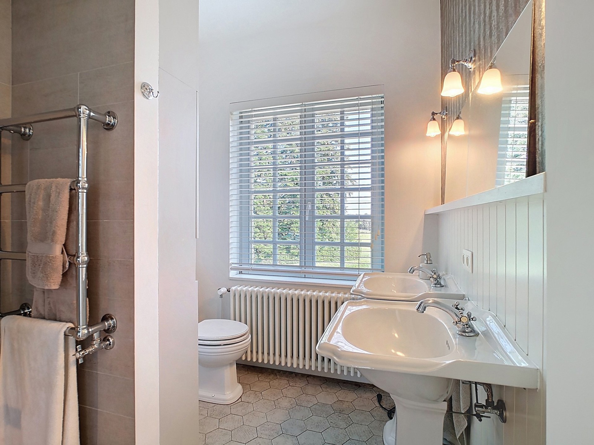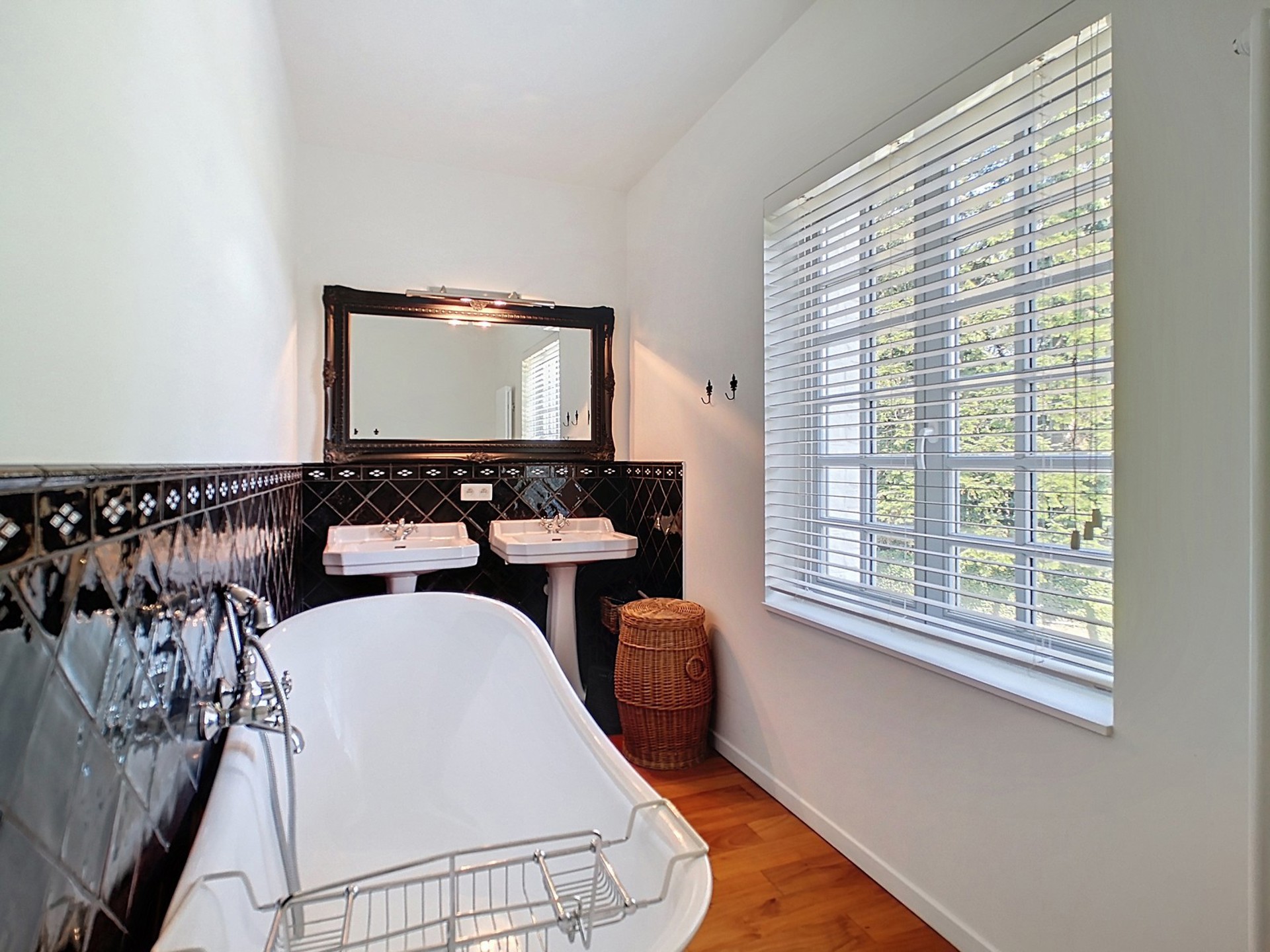 Salle de bains de 7 m² (2 lavabos sur pied, baignoire sur pied).