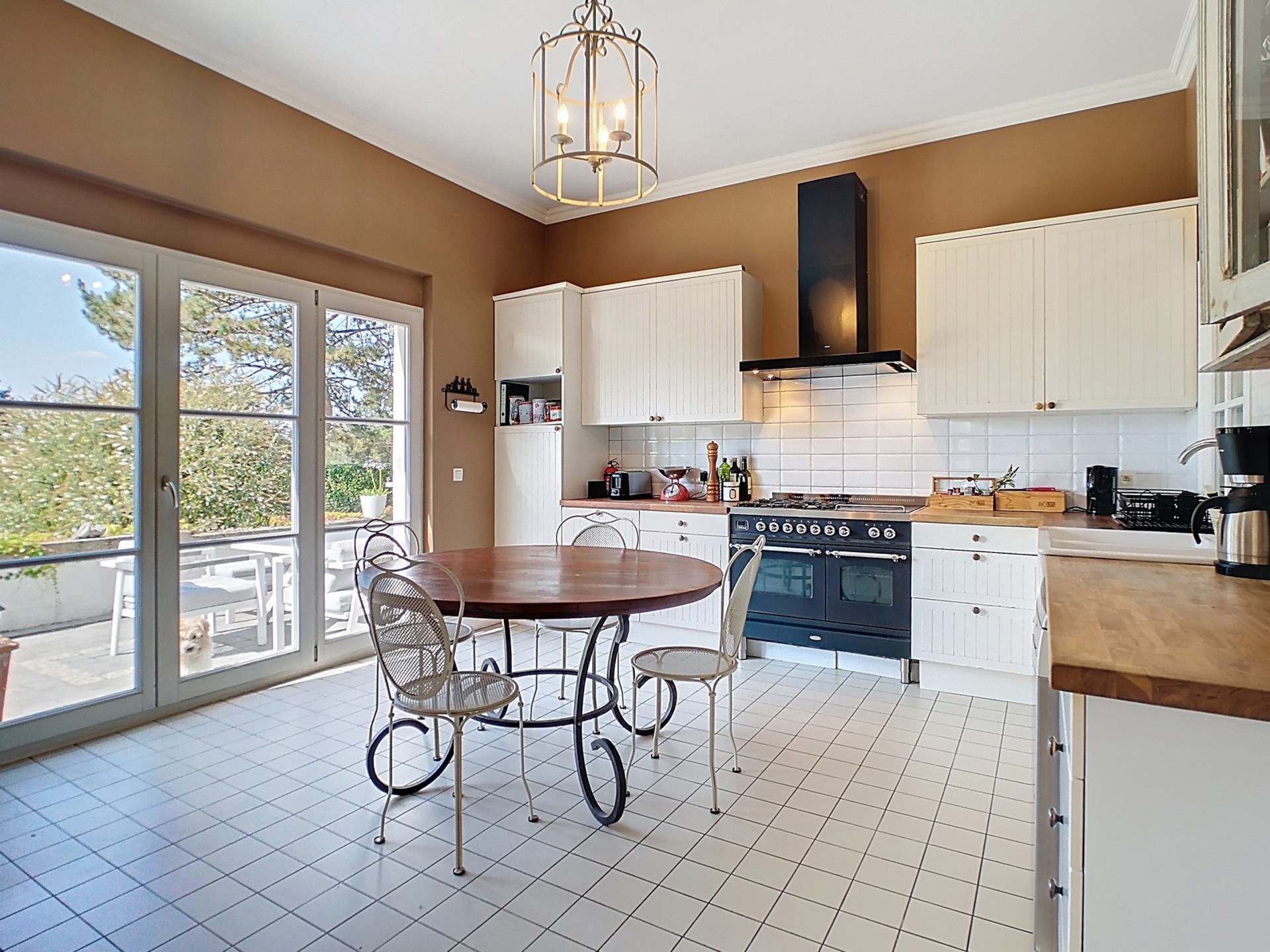 Cuisine équipée de 19 m² avec coin à déjeuner, accès à la terrasse et au jardin.