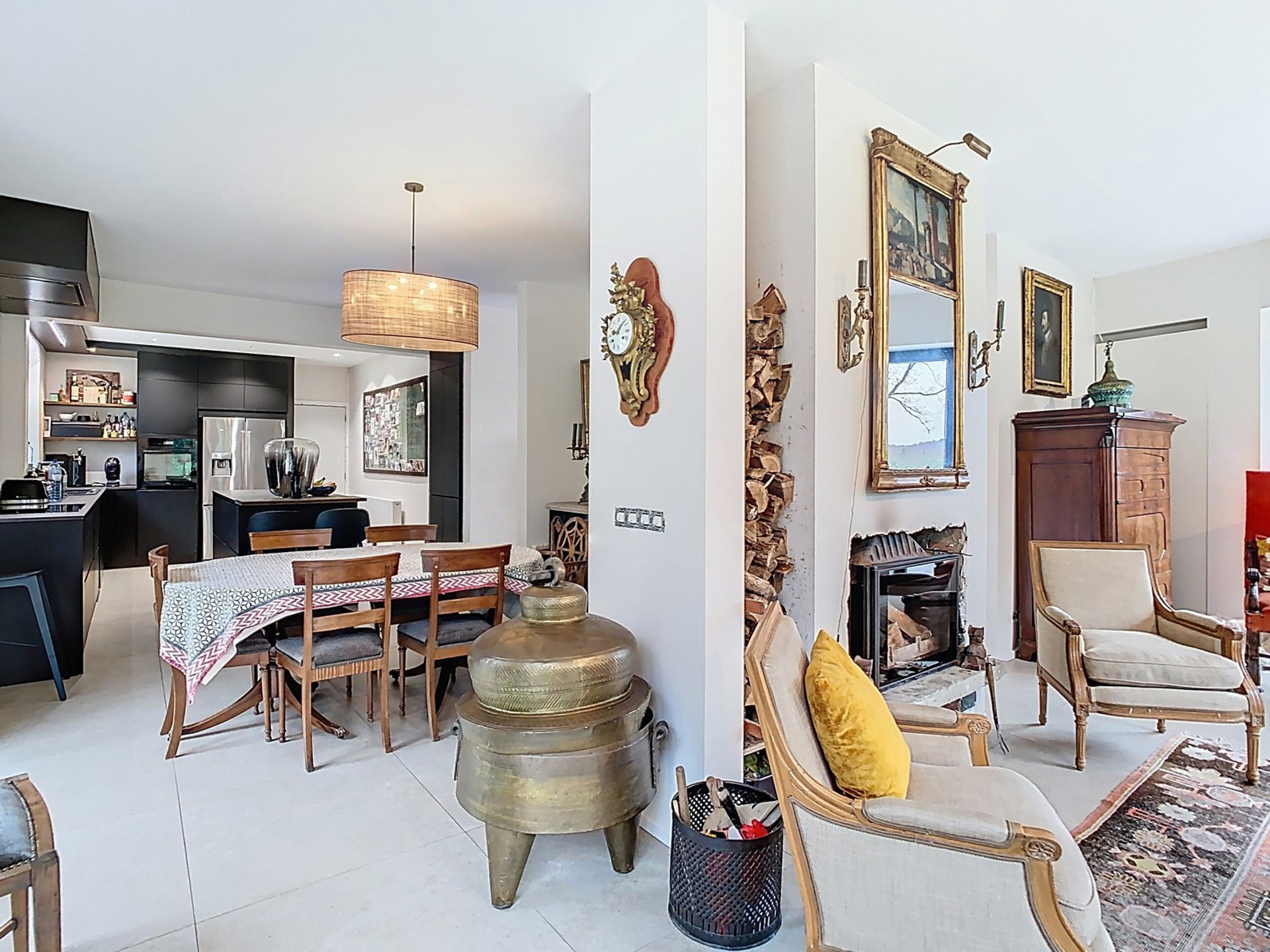 Grande cuisine ouverte sur la salle à manger et sur le salon avec feu ouvert à cassette, accès à la terrasse.