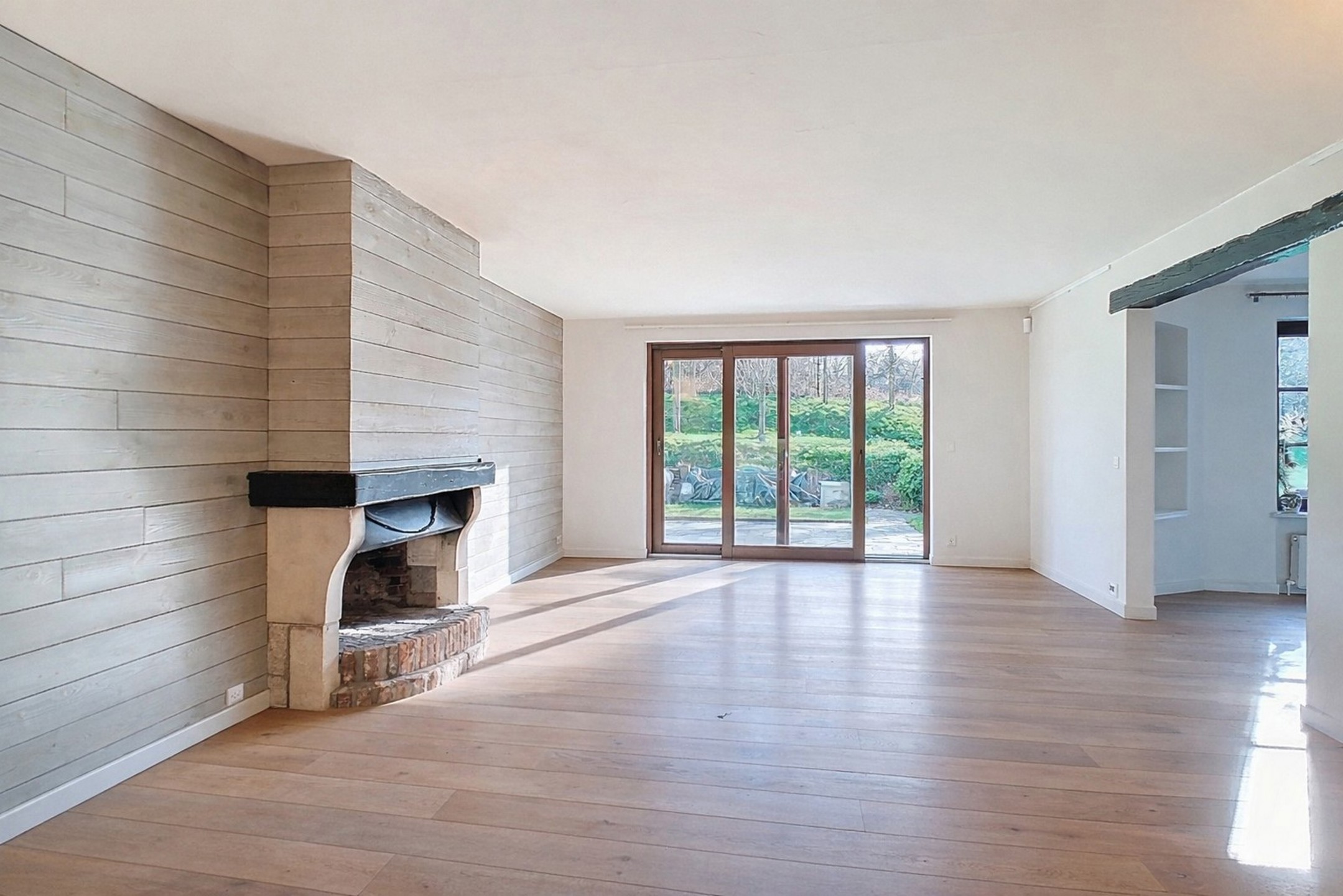 Salon accueillant de 32 m² avec feu ouvert et accès au jardin.