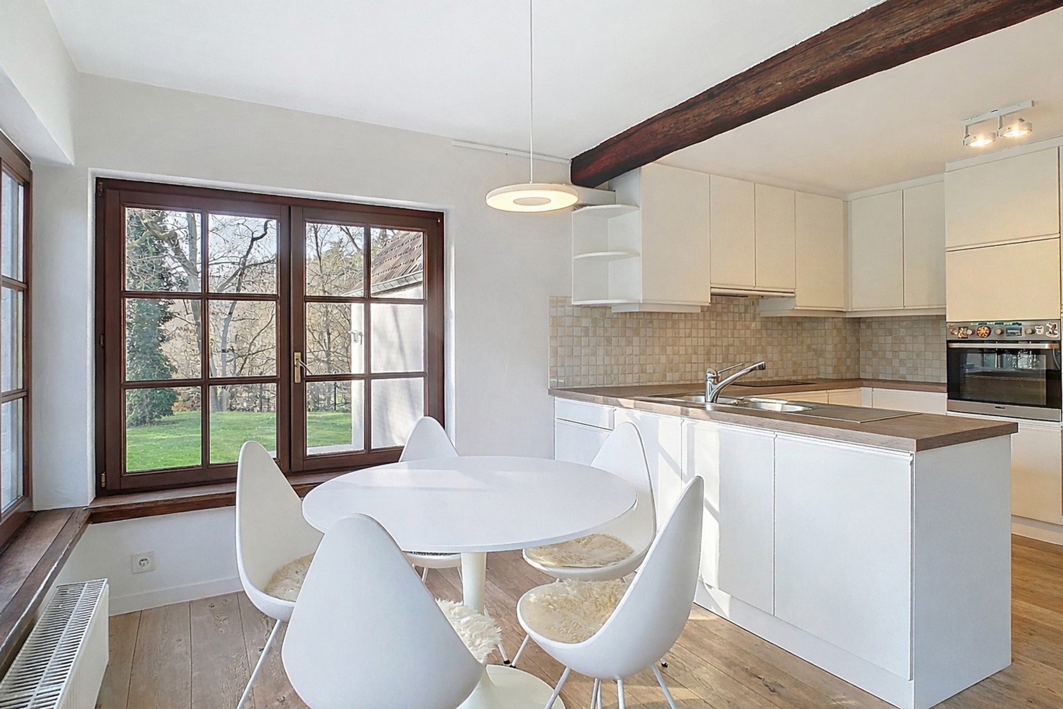 Cuisine équipée lumineuse de 19 m² avec coin à déjeuner bénéficiant d’un accès et d’une belle vue sur le jardin.
