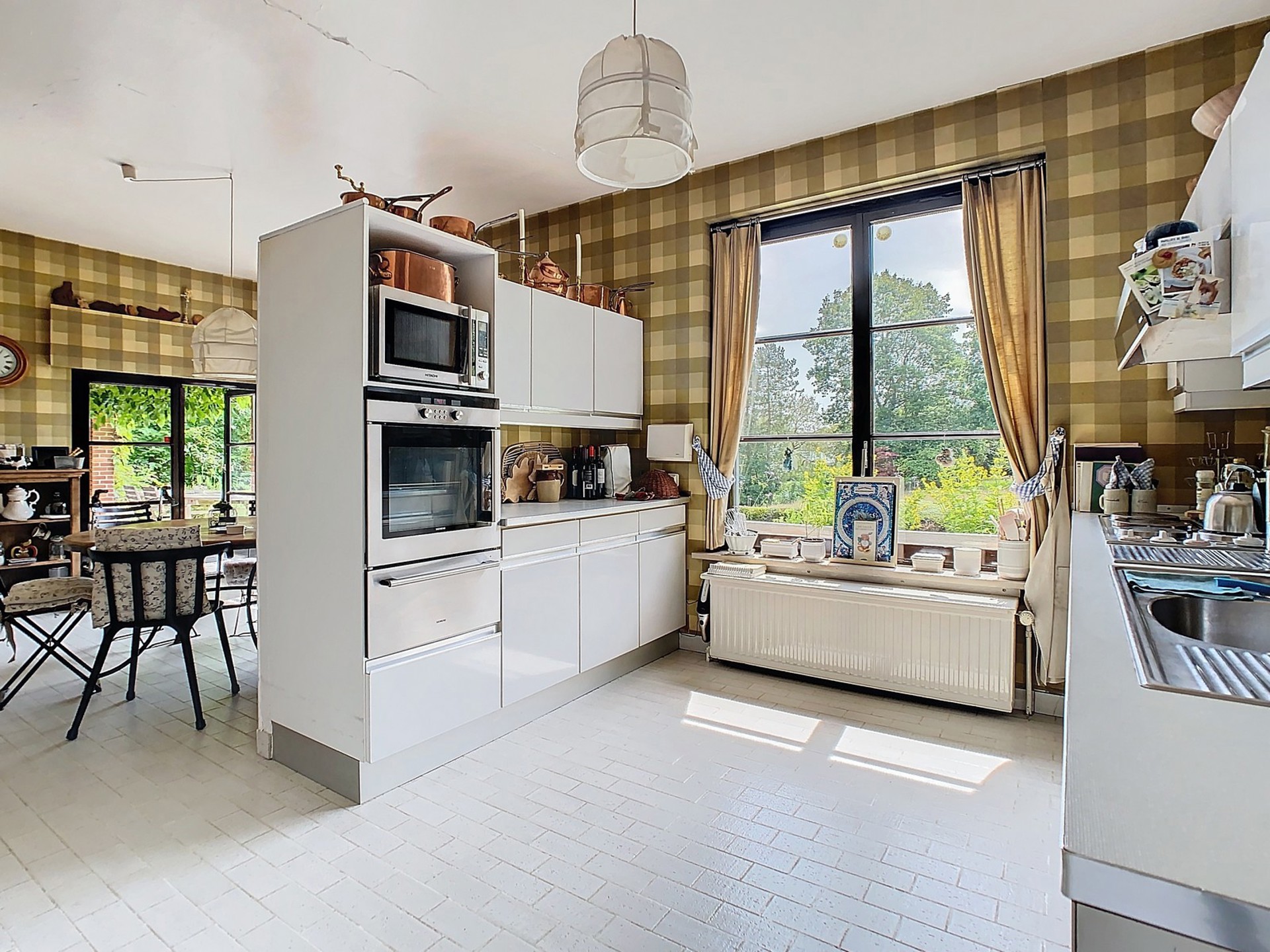 Cuisine équipée d’époque avec coin à déjeuner de 30,5 m² et accès à la terrasse couverte.