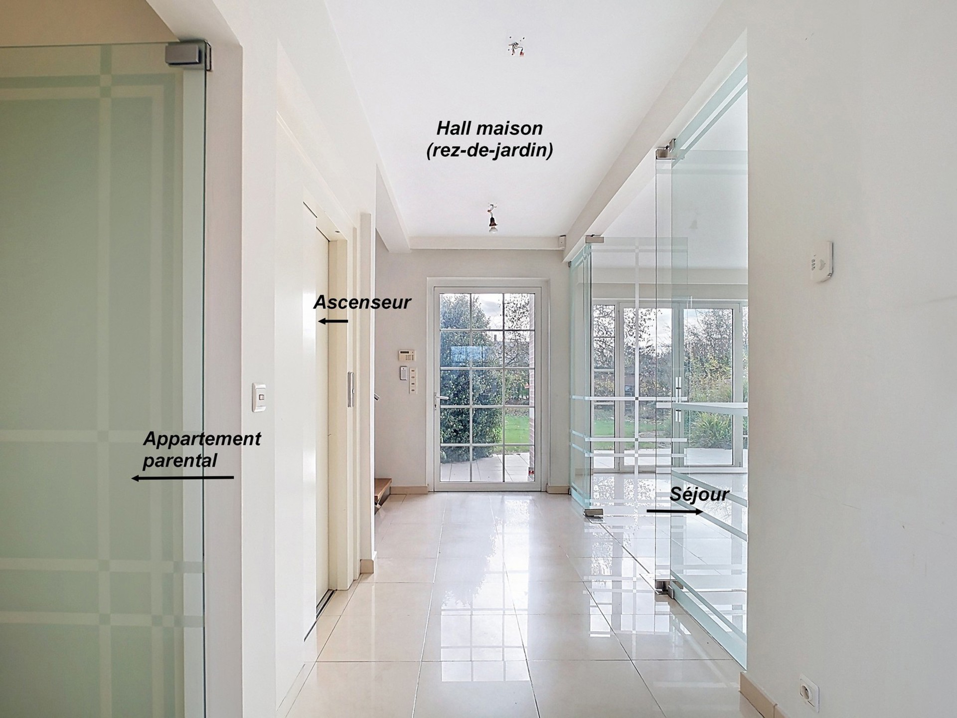 Hall de 12 m² avec accès au jardin – Ascenseur et escalier.