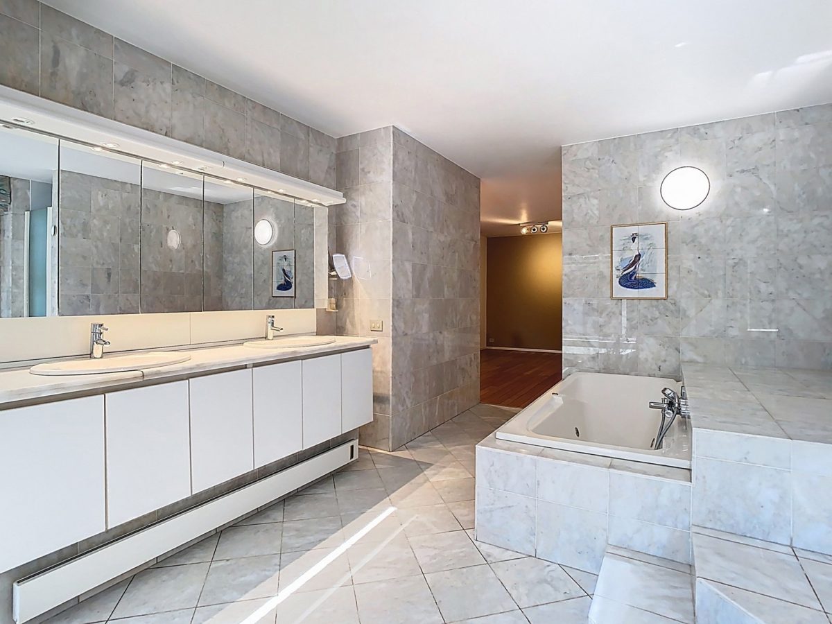 Salle de bains avec 1 entrée pour chaque chambre (deux lavabos, un bain central).