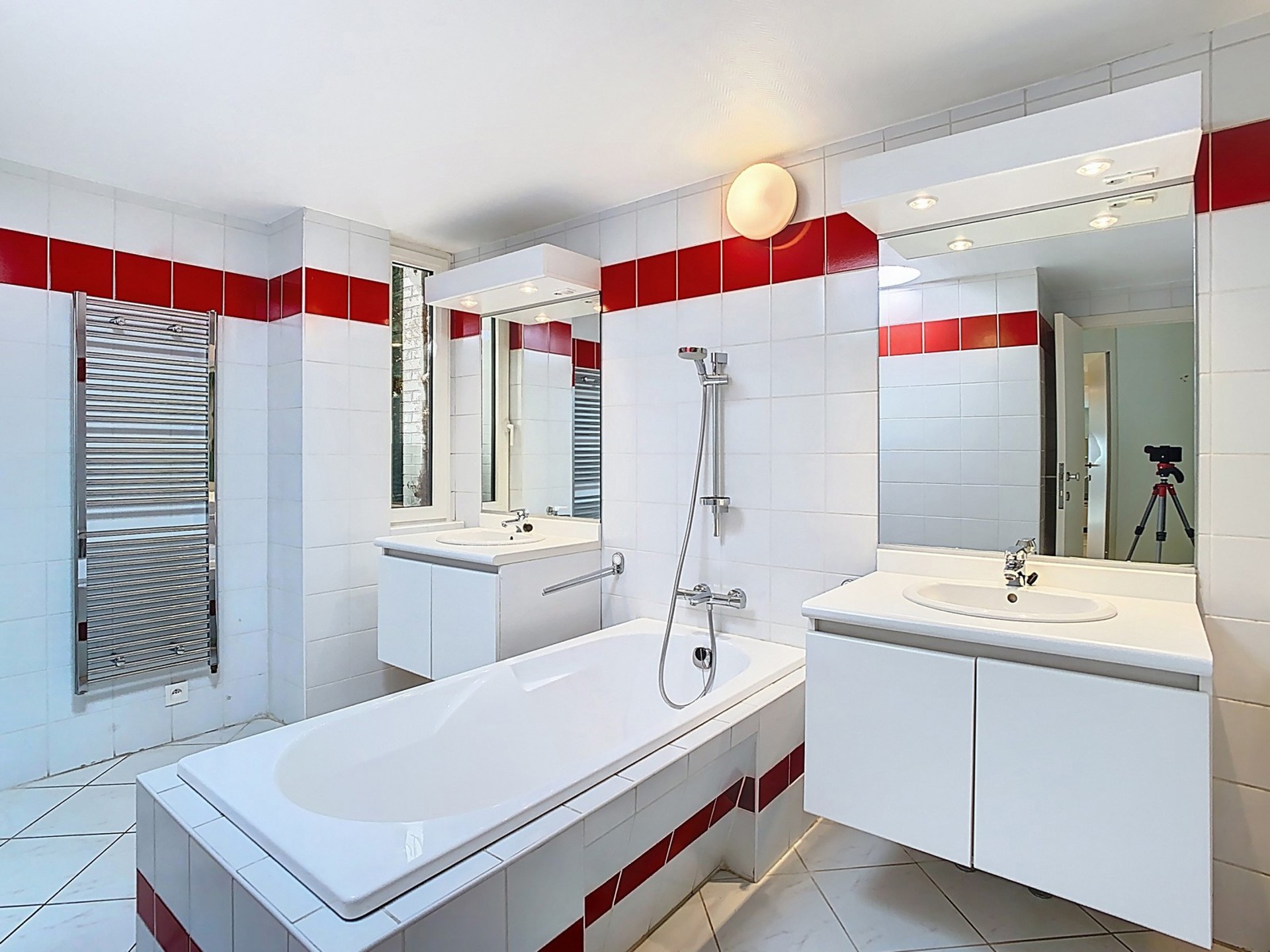 Salle de bains avec 1 entrée pour chaque chambre (deux lavabos, un bain central).