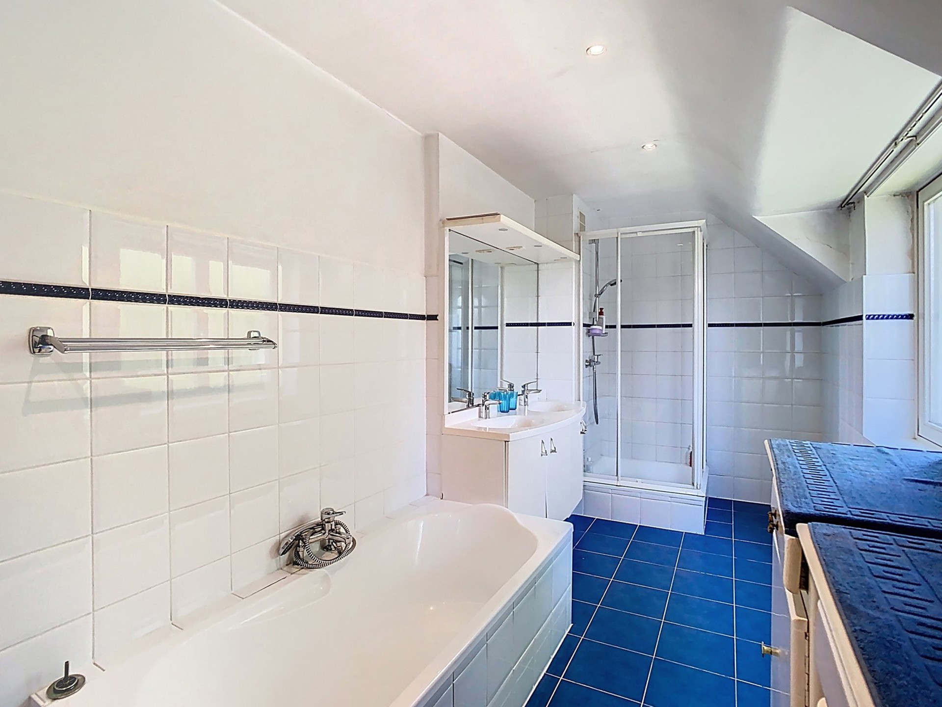 Salle de bains des années 90 (meuble double lavabos, douche individuelle, baignoire et toilette).