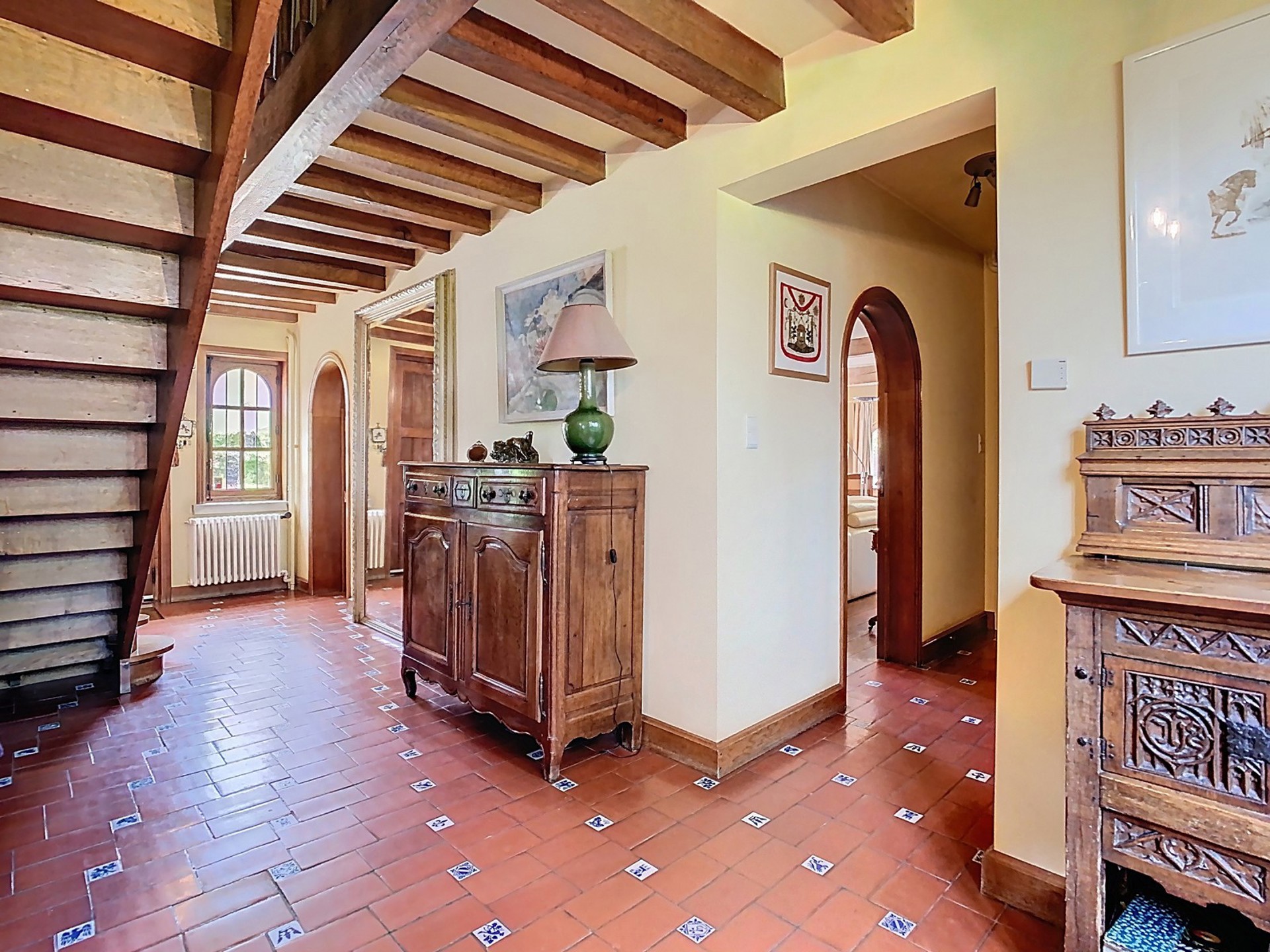 Hall d’entrée spacieux de 24 m² – espace vestiaire – toilette invités (dallage de caractère ancien).