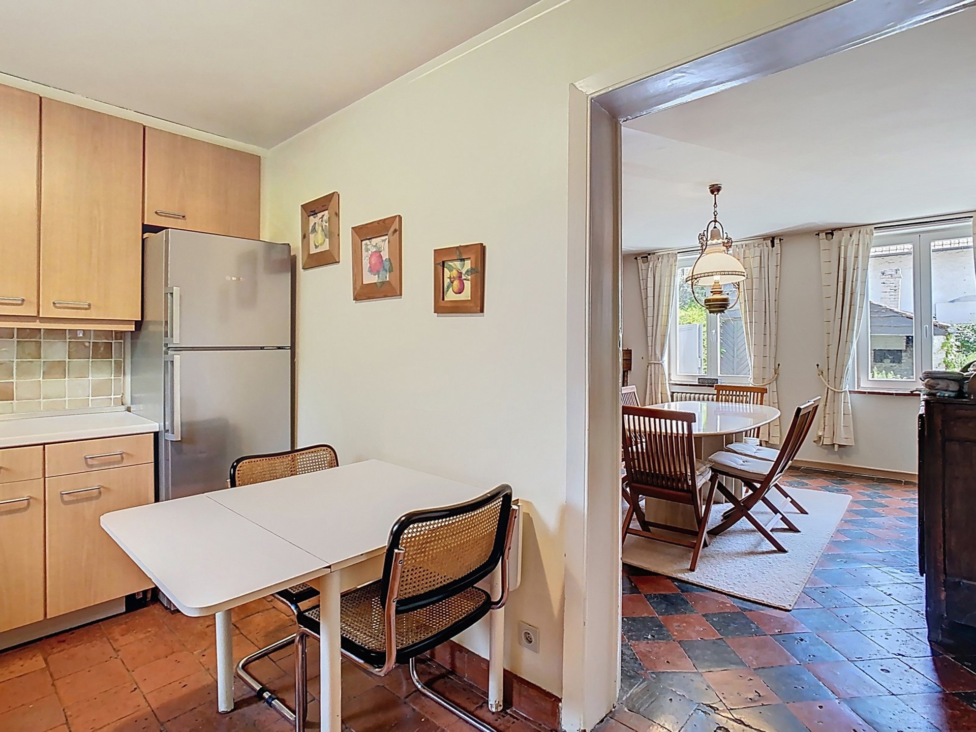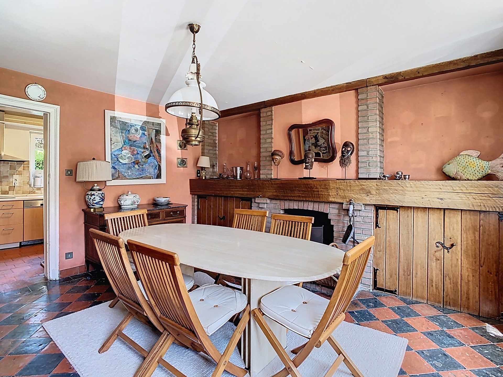 Salle à manger de 18 m² avec feu ouvert (tomettes à damier noir et rouge).