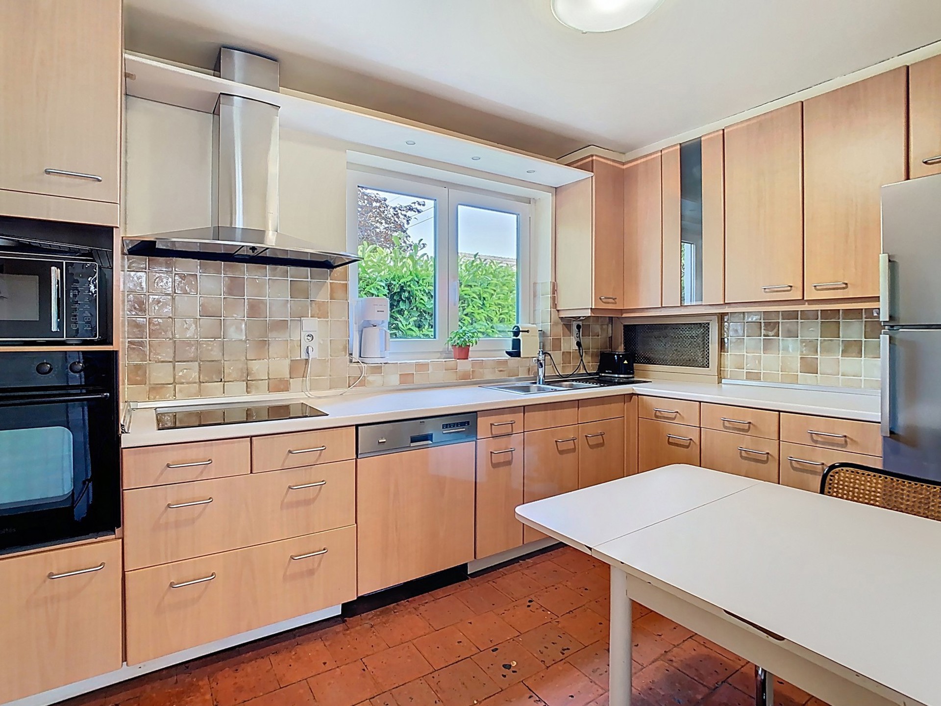 Cuisine équipée de 10 m² des années 90 avec un petit coin à déjeuner (tomettes).