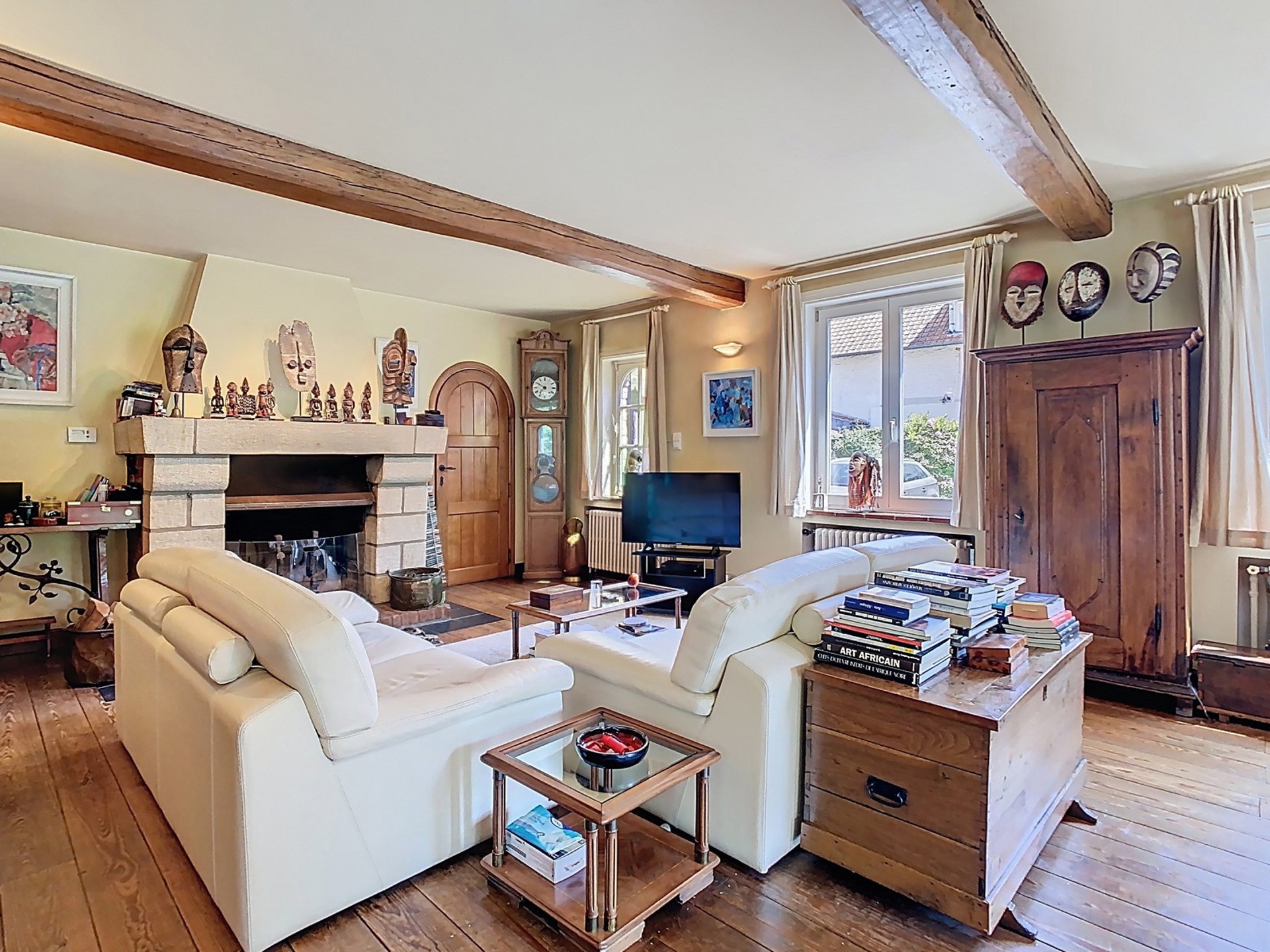 Séjour de 54 m² avec feu ouvert bénéficiant de deux portes-fenêtres donnant accès à la terrasse et au jardin.