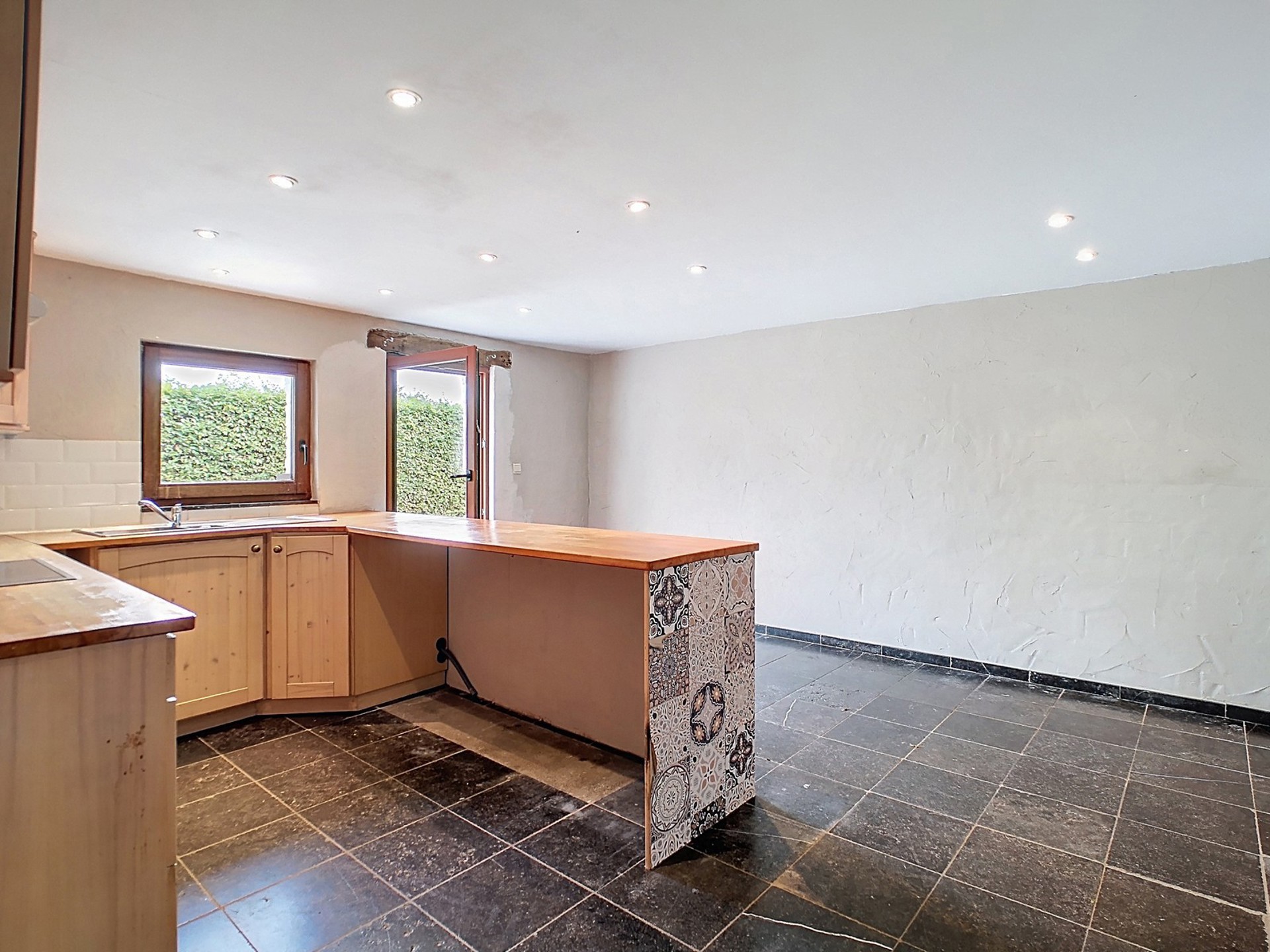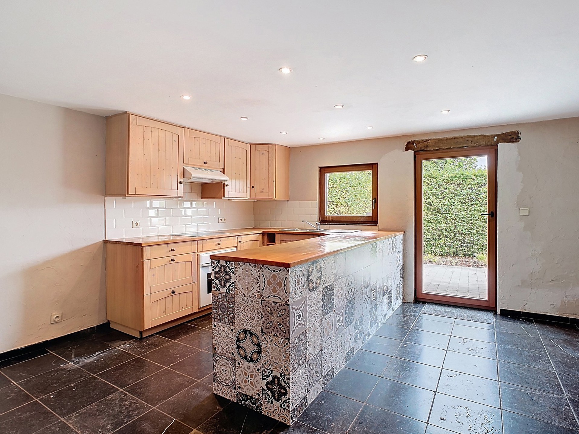 Cuisine semi-équipée de 20 m² avec coin à déjeuner et accès vers le jardin.