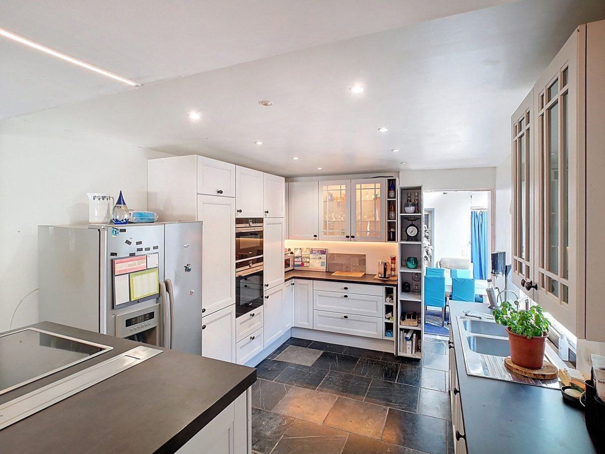 Grande cuisine actuelle super équipée de 25 m² (2019) (lave-vaisselle, réfrigérateur, cave à vin, taques de cuisson, hotte encastrée, plan de travail noir, beaucoup de rangement, ilot central / coin à déjeuner).