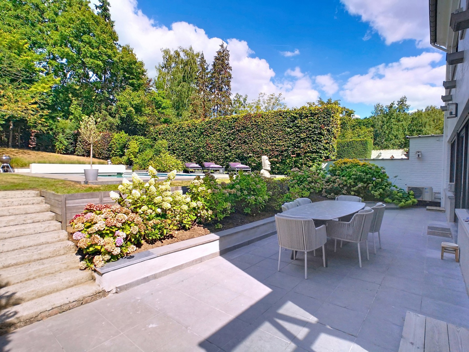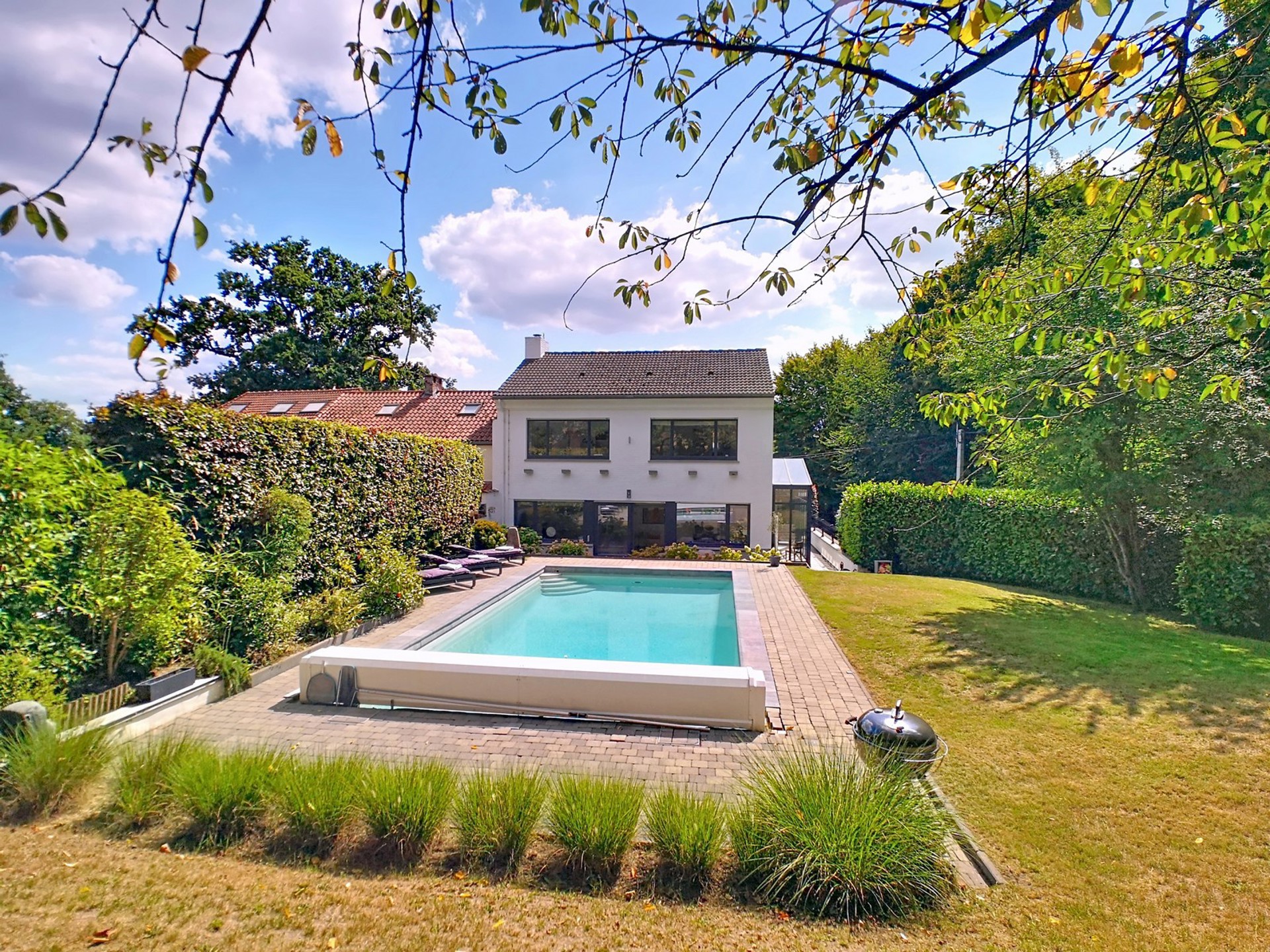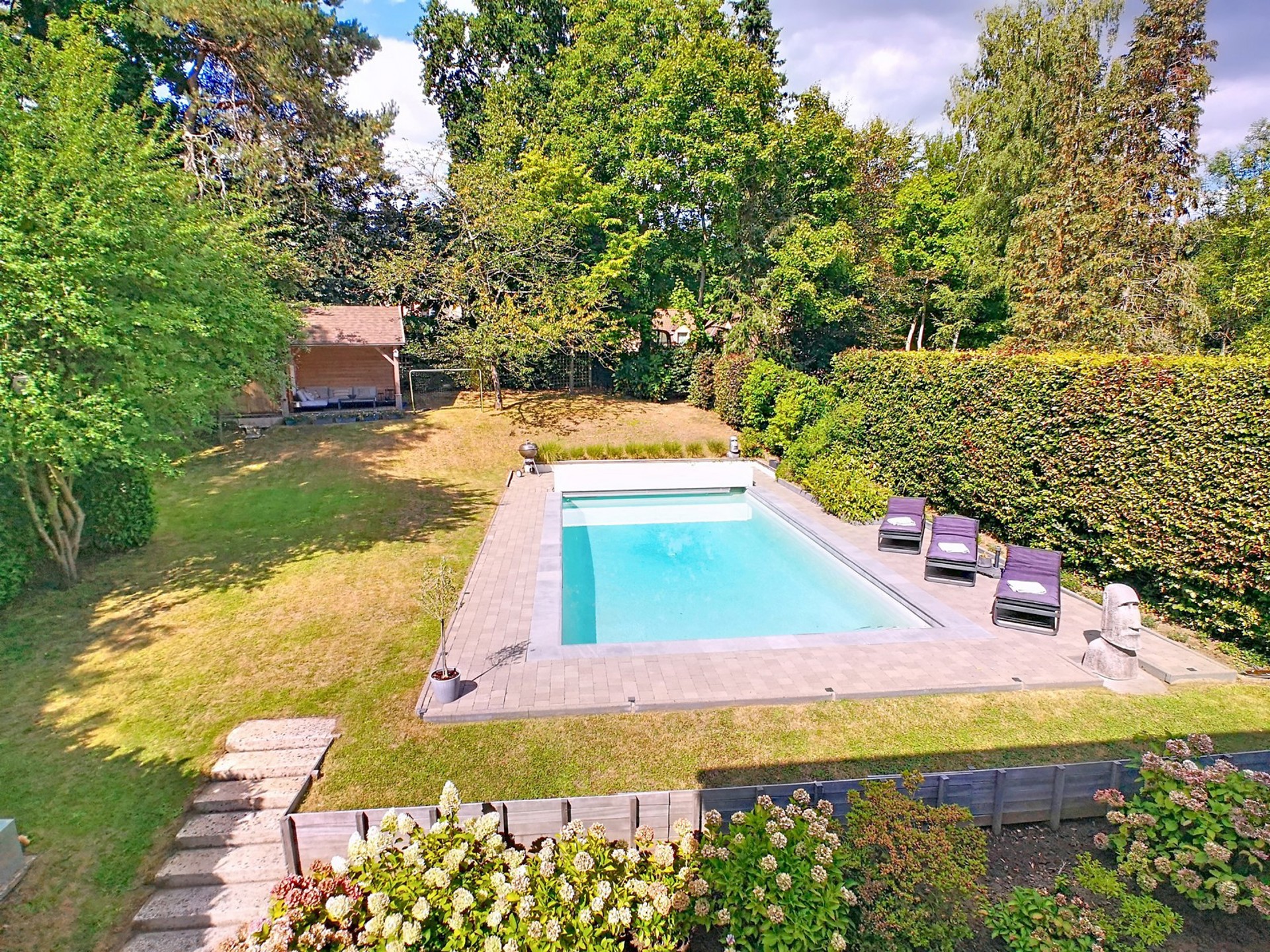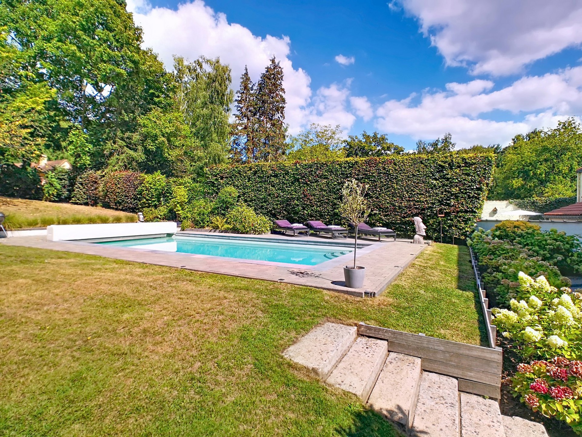 sur un terrain de +/- 7 ares 70 centiares agrémenté d’une PISCINE.