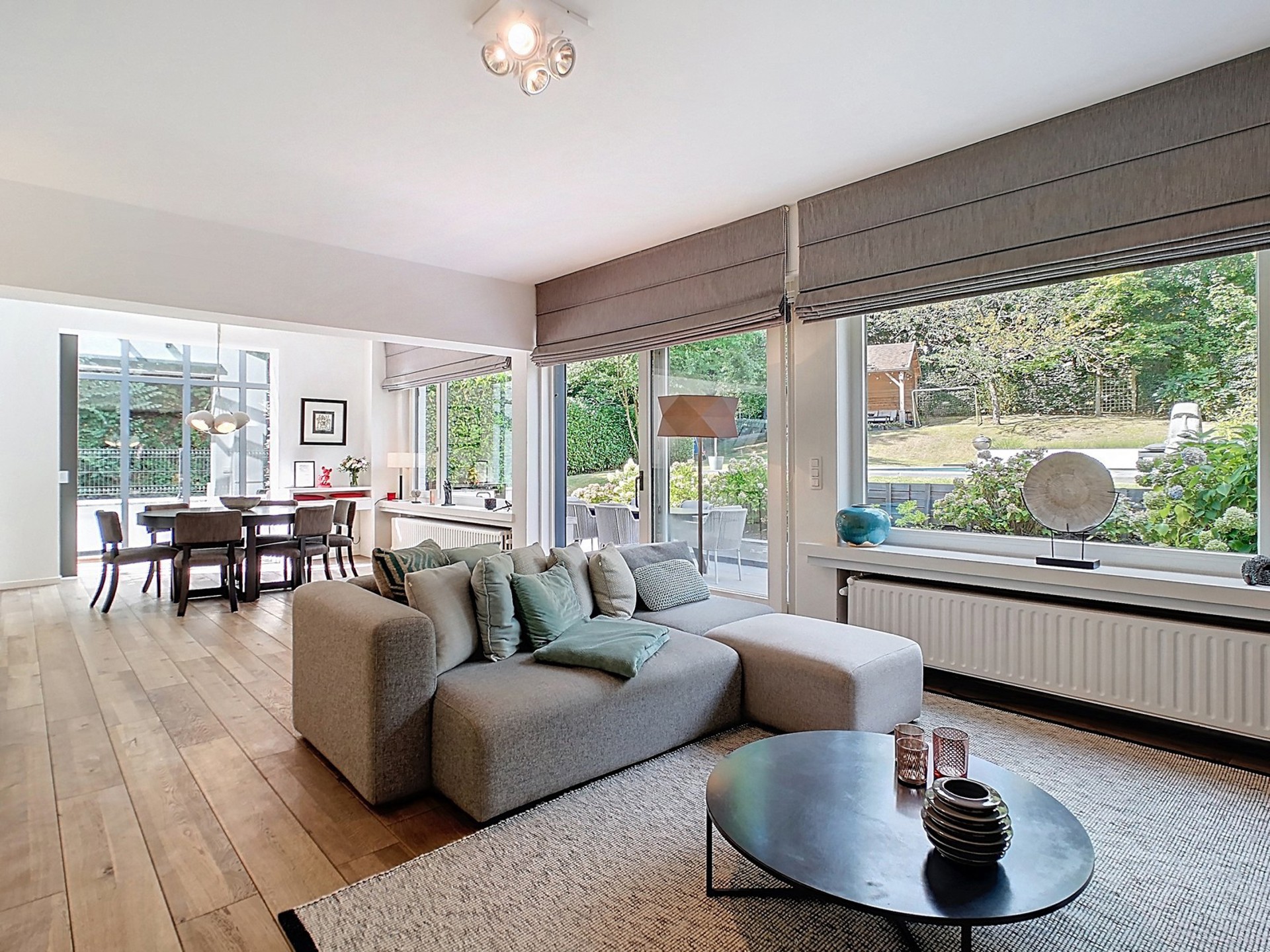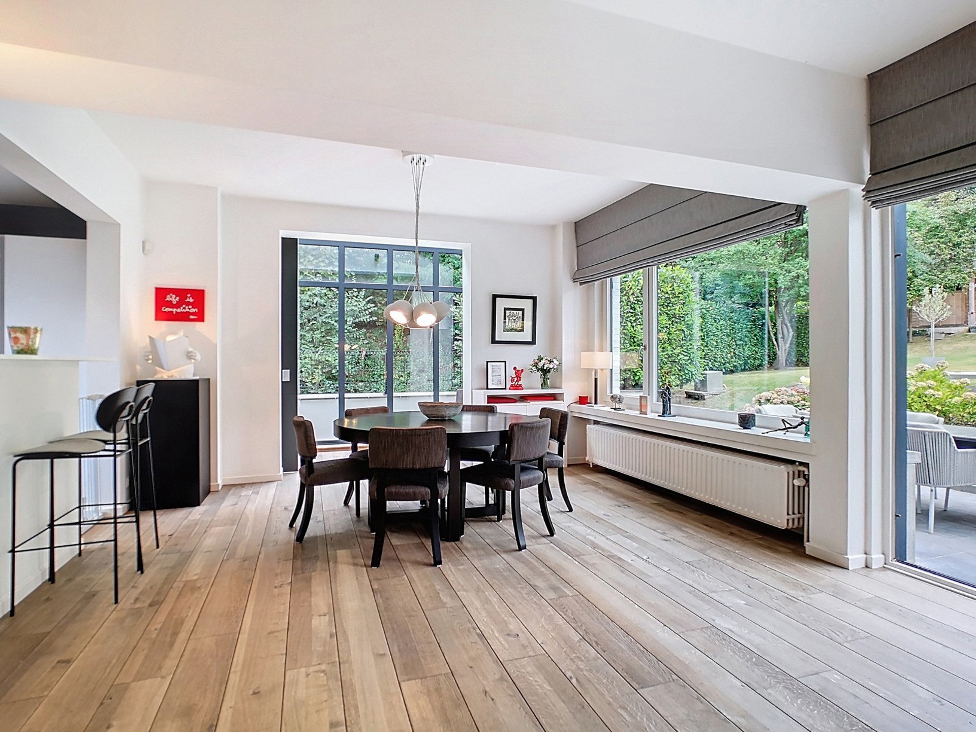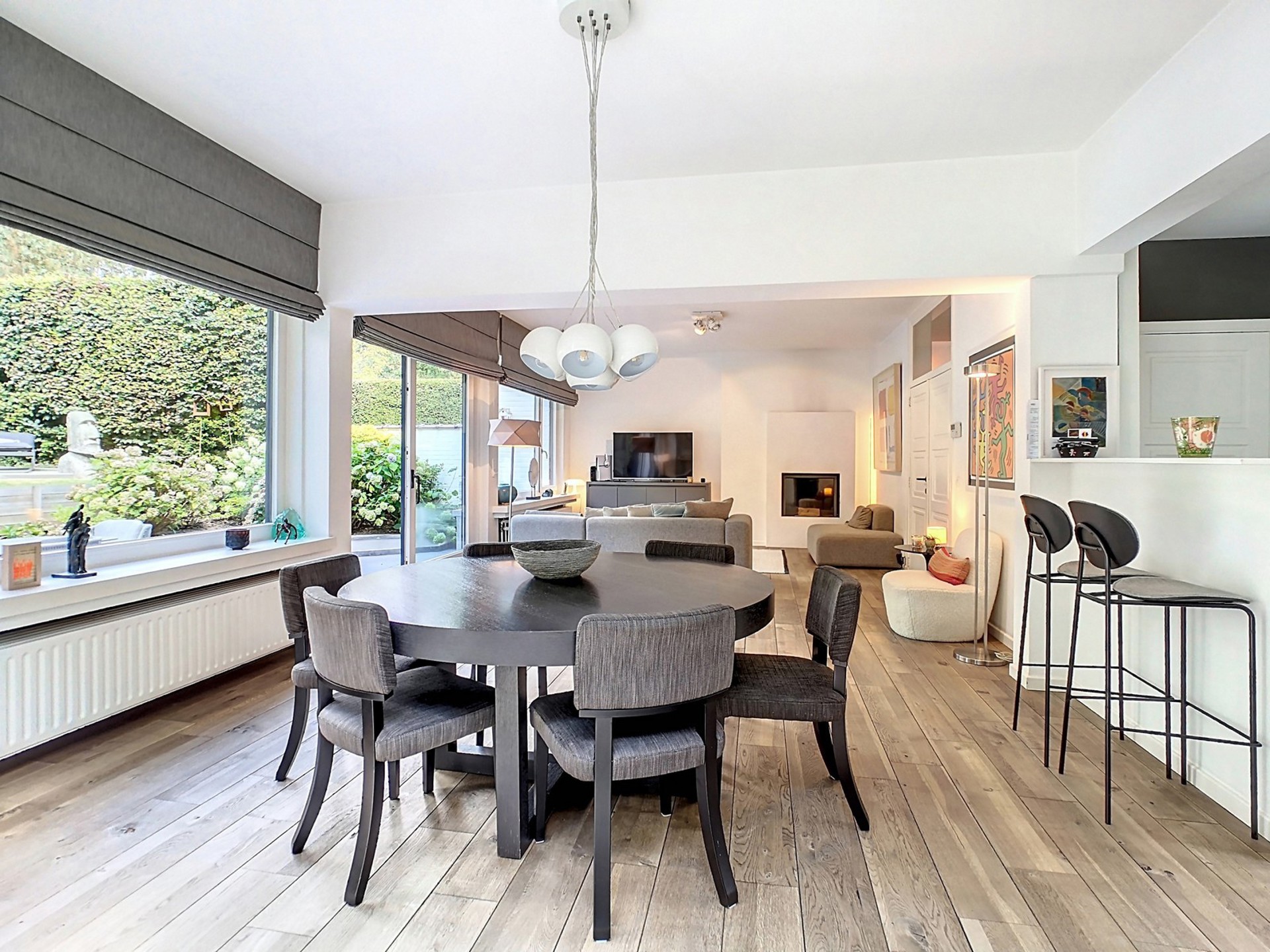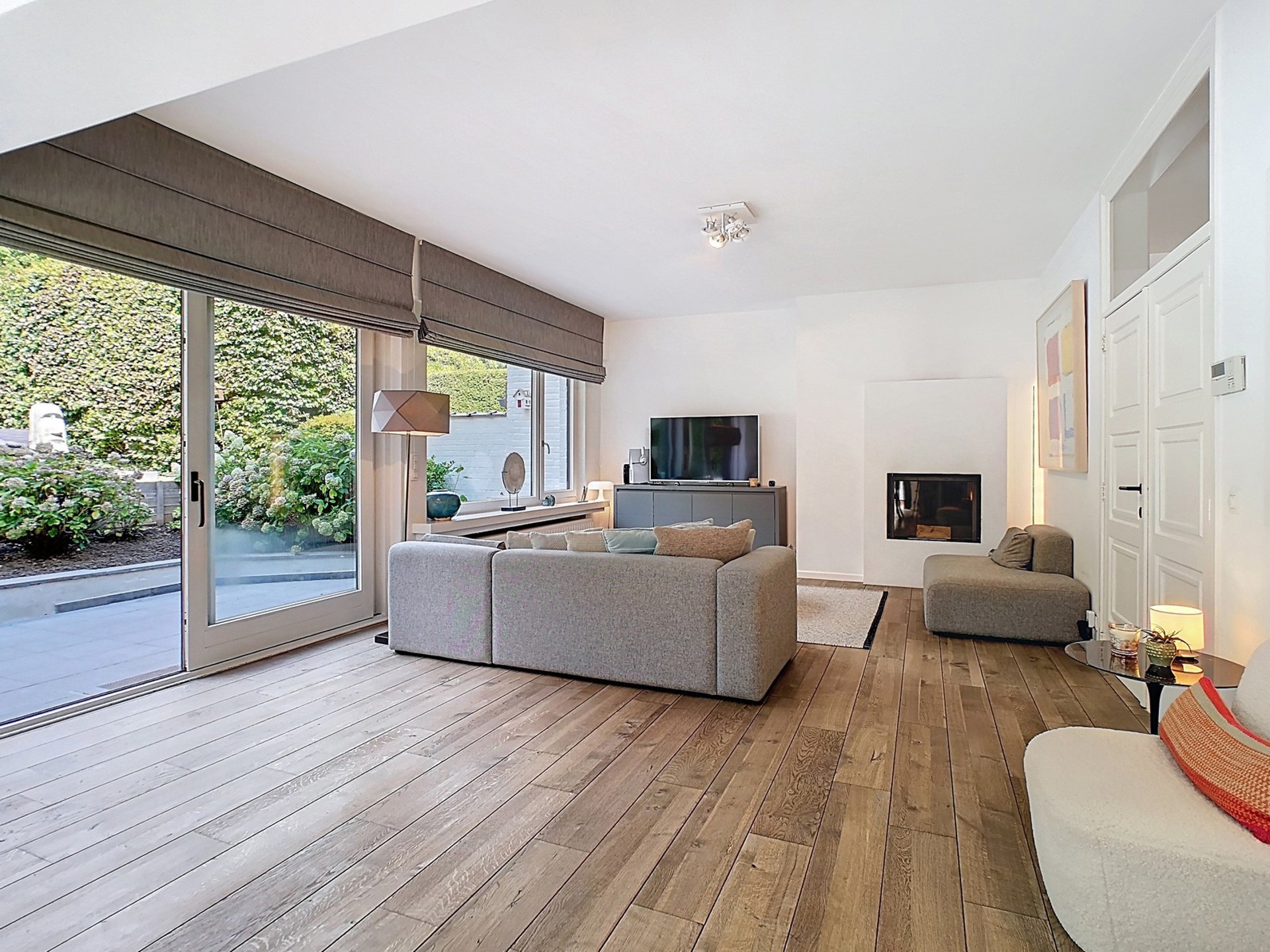 Séjour de 52 m², spacieux et lumineux, agrémenté d’un feu ouvert à cassette, d’une véranda avec belle porte coulissante joliment revêtue de cuir ainsi que d’un accès à la terrasse et au jardin.