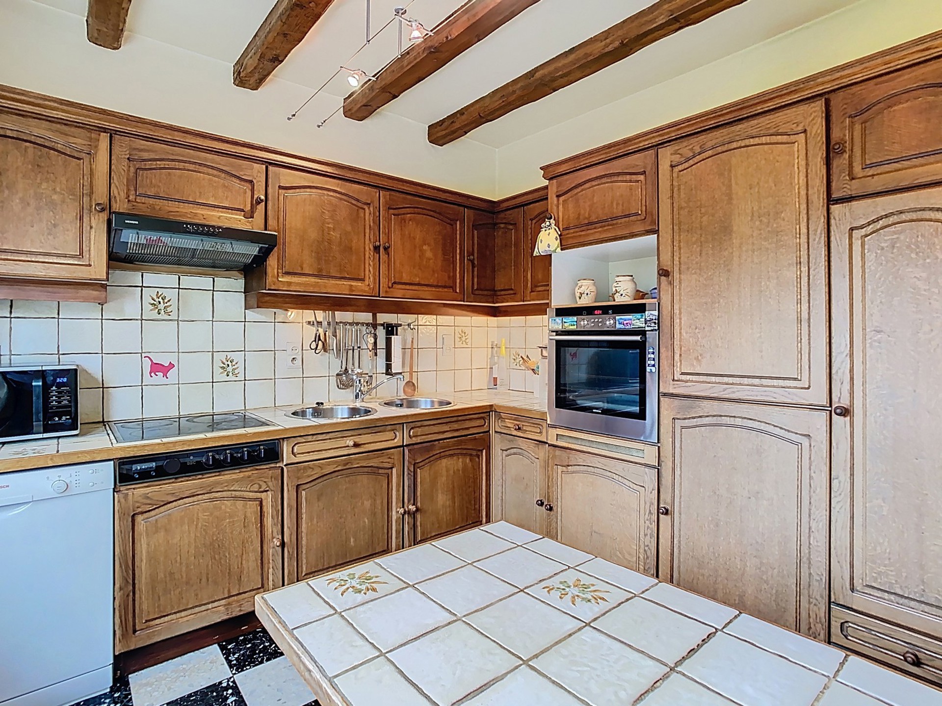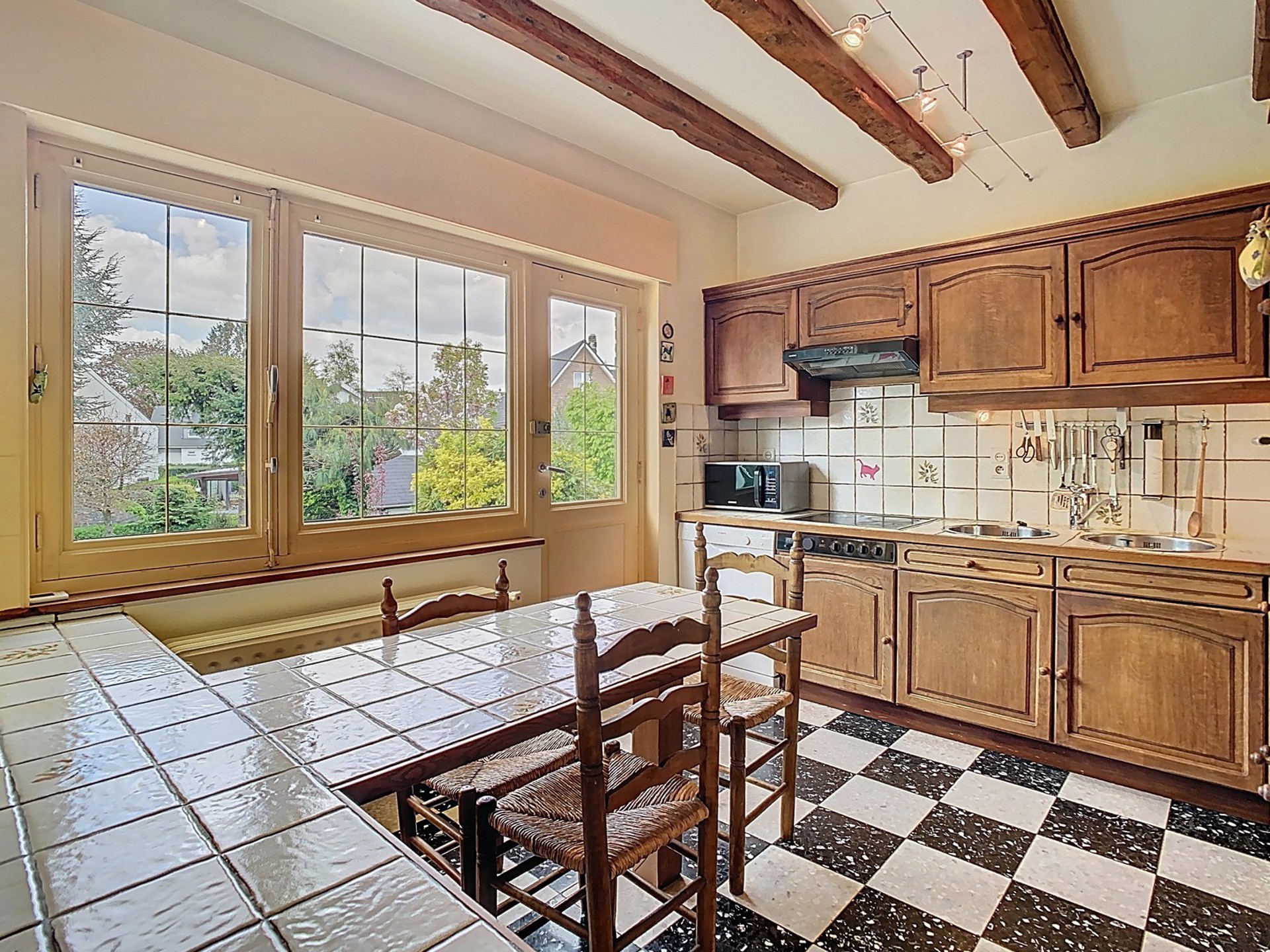 Cuisine d’origine de +/- 10 m² avec accès à la terrasse.