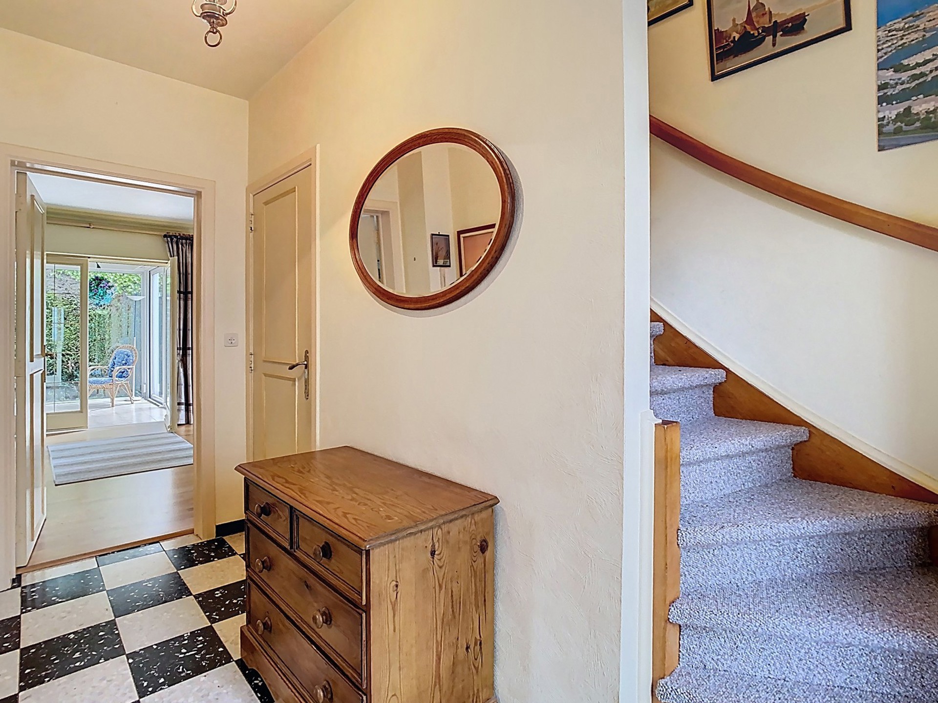 Hall d’entrée de +/- 7,5 m² avec toilette et vestiaire.
