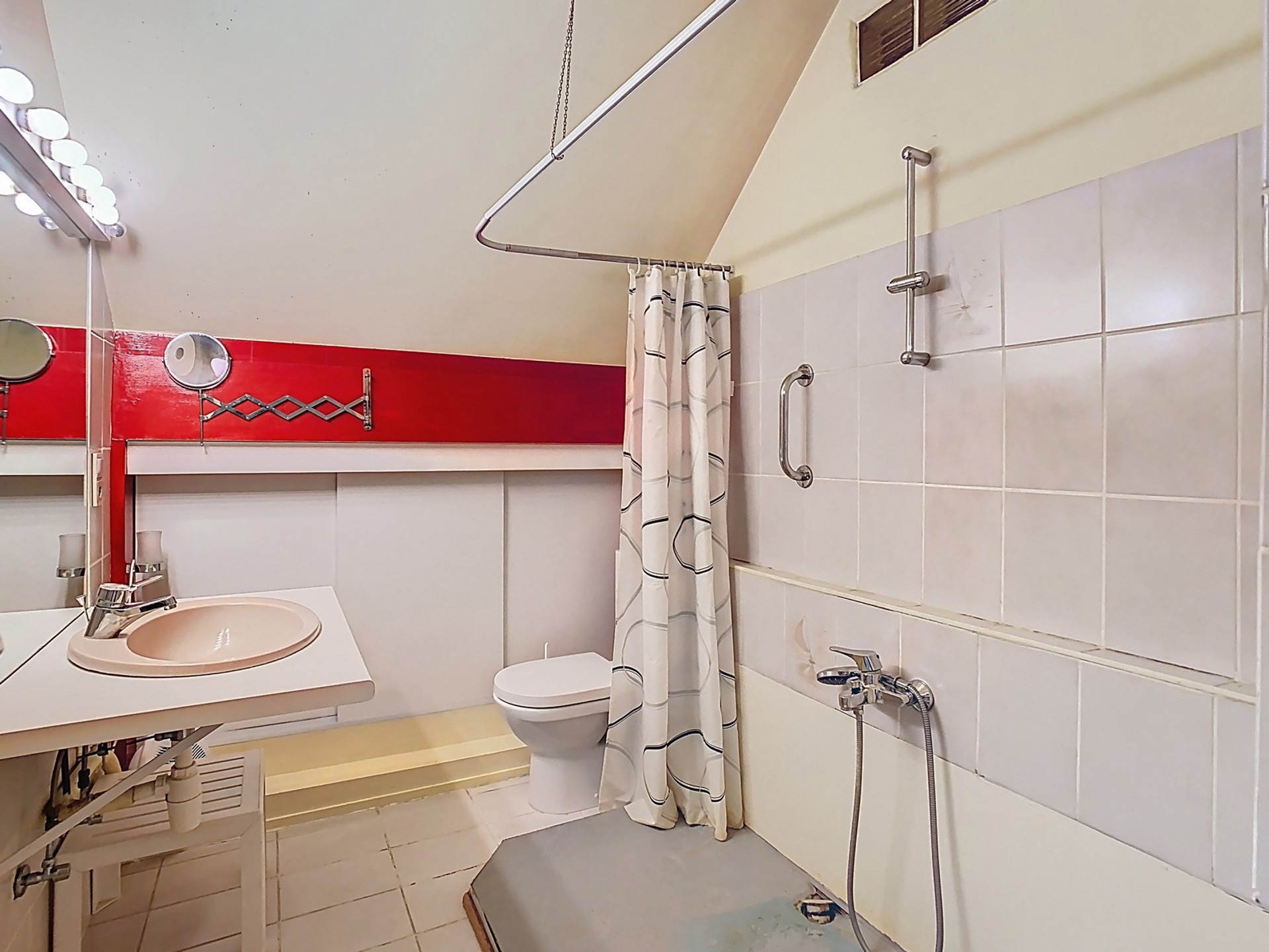 Salle de bains (lavabo, douche et toilettes, à rénover).