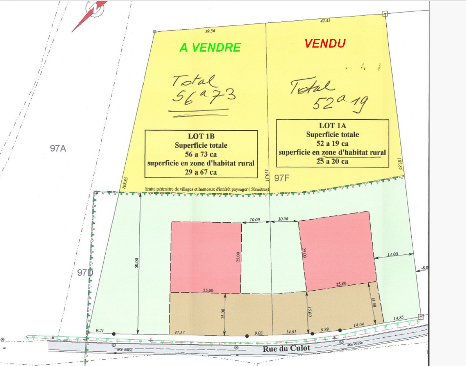 Zone de bâtisse 625 m² (25 m x 25 m) avec une zone de recul de 15 m.