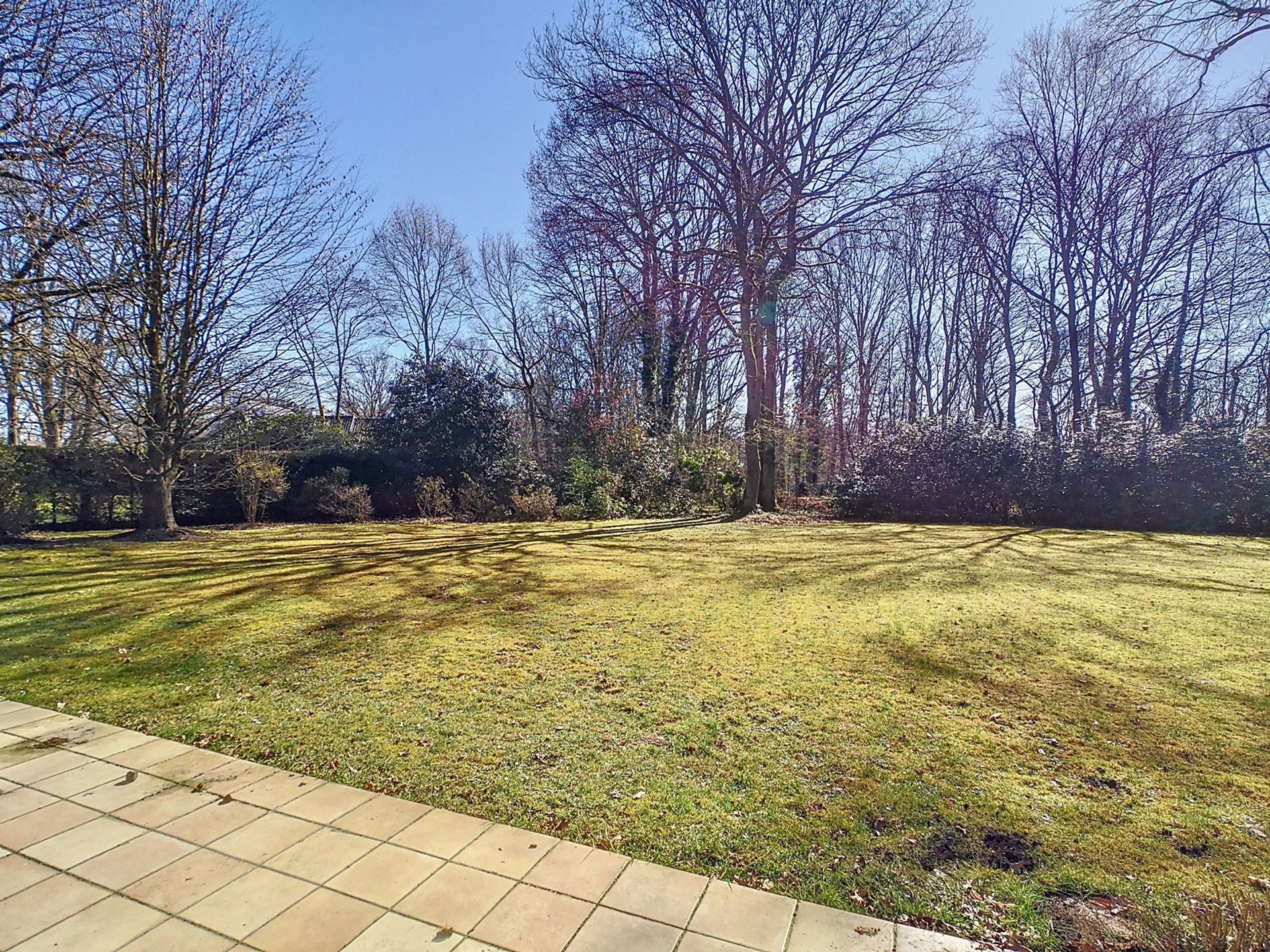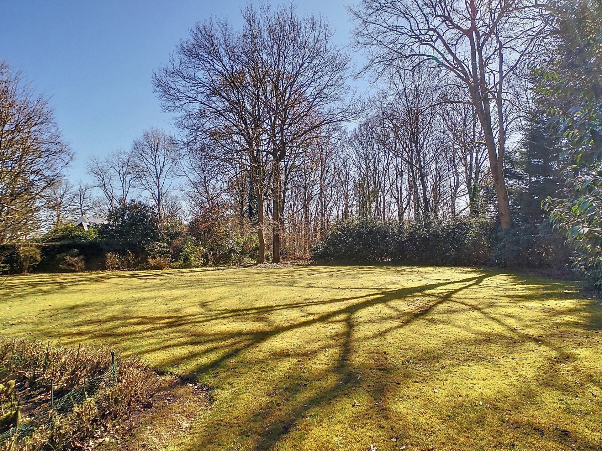 Beau terrain plat, bien entretenu, entouré de haies vives (rhododendrons, …). Présence d’une partie boisée dans le fond du jardin.