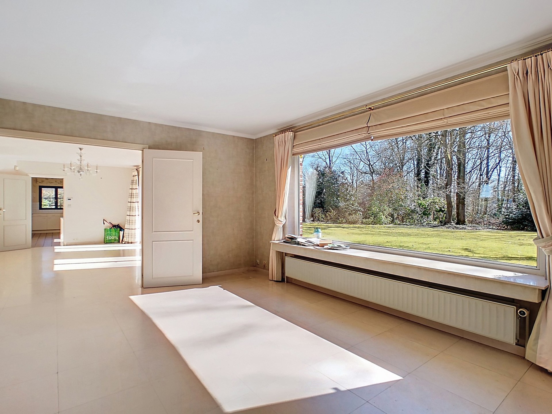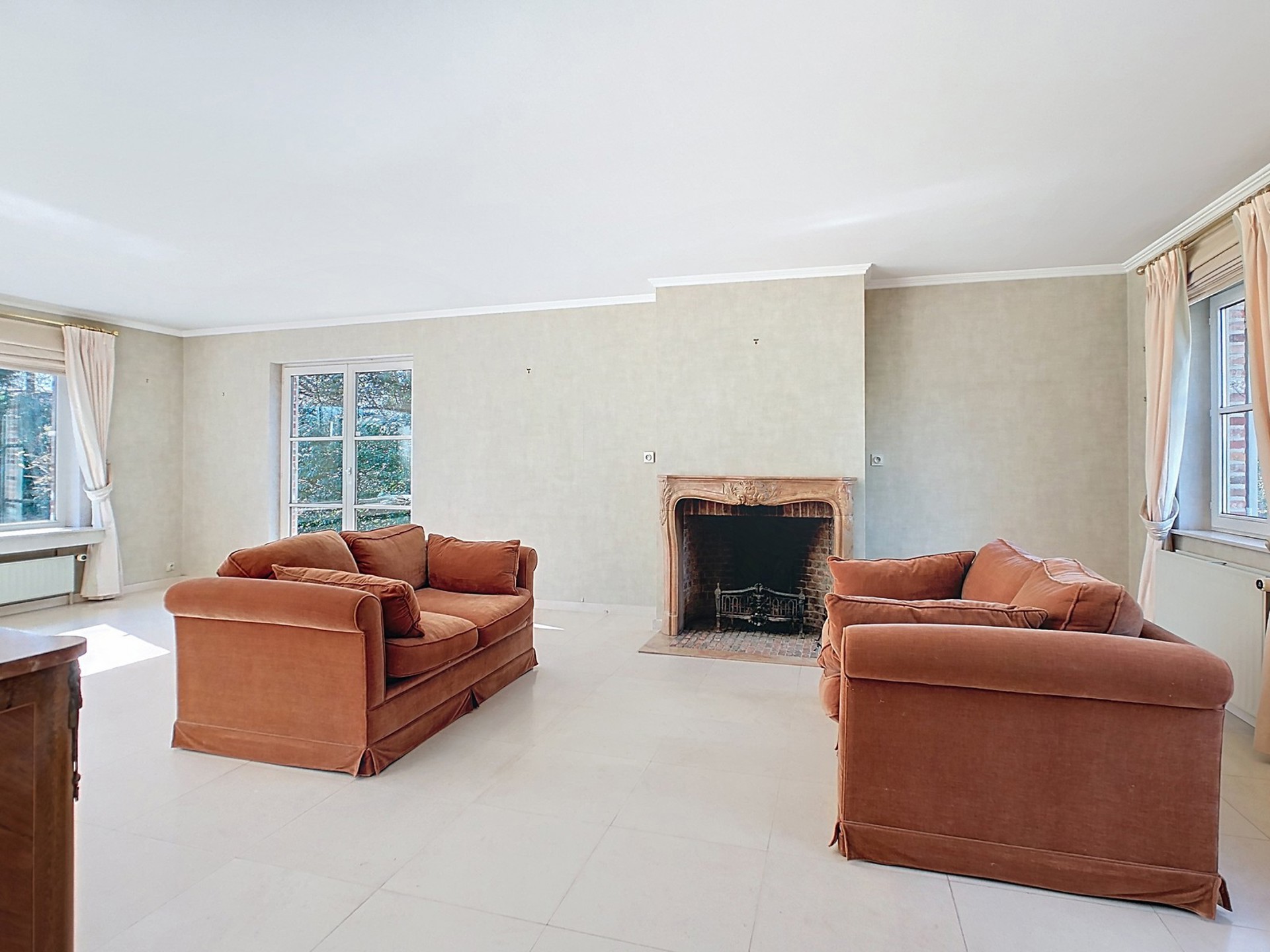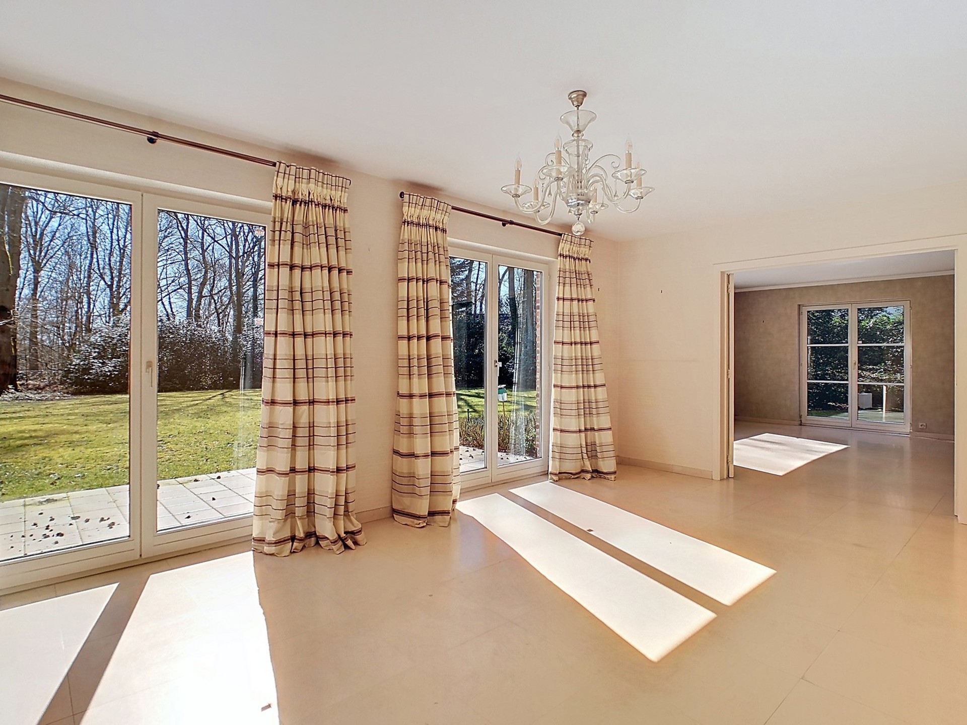 Salon de 40 m² agrémenté d’un feu ouvert, d’une superbe vue sur le jardin et avec accès au jardin (Dalles de Bourgogne).