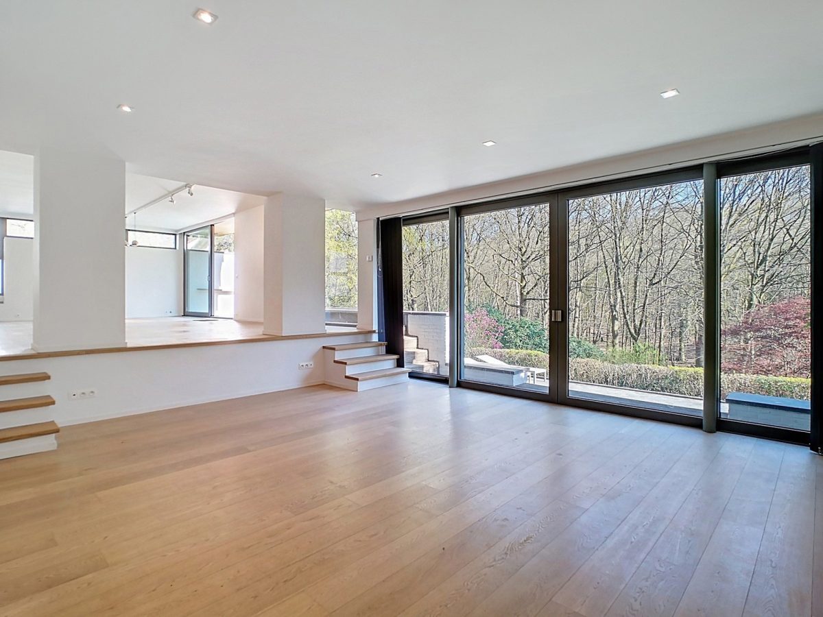 Séjour de 68 m² (plancher), vaste et lumineux, sur 2 niveaux, agrémenté d’un insert, d’une superbe vue sur la nature environnante et d’un accès à la spacieuse terrasse de +/- 70 m².